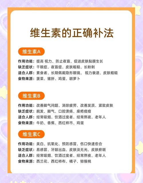 维生素的秘密和作用,以及各种维生素的服用说明 在现代生活节奏日益加快的今天,越来越多的人开始关注健康与营养。维生素作为人体必需的微量营养素,扮演着至关重要的角色。它们不仅关系到身体的正常代谢,还影响着免疫力、皮肤健康、神经系统以及多种器官的功能。了解维生素的秘密、作用以及合理的服用方法,对于保持身体健康具有重要意义。 一、维生素的基本概念与分类 维生素是人体无法自身合成或合成不足,必须通过食物摄取的有机物质。它们虽在体内的含量极少,但作用却极其重要。根据溶解性质,维生素主要分为两大类:脂溶性维生素和水溶性维生素。 脂溶性维生素包括维生素A、D、E和K。这类维生素可以在脂肪组织和肝脏中储存,摄入过多可能引起中毒,因此需要注意用量。而水溶性维生素则包括维生素B族和维生素C,它们不易在体内储存,过量后会随尿液排出,因此每日摄入量较为重要。 二、各类维生素的作用 1. 维生素A:主要作用是维护视觉健康,促进皮肤和黏膜的健康,增强免疫力。缺乏维生素A会导致夜盲症、免疫力下降甚至皮肤干燥、角化异常。 2. 维生素D:帮助钙和磷的吸收,促进骨骼和牙齿的发育与健康。缺乏维生素D会引起佝偻病、骨软化症,成人缺乏还可能导致骨质疏松。 3. 维生素E:具有抗氧化作用,保护细胞免受自由基损伤,改善血液循环,增强免疫功能。缺乏时可能出现肌肉无力、视力模糊等症状。 4. 维生素K:参与血液凝固过程,促进骨骼健康。缺乏会导致出血倾向和骨质疏松。 5. 维生素B族:包括B1(硫胺素)、B2(核黄素)、B6(吡哆醇)、B12(钴胺素)等。它们共同作用于能量代谢、神经系统、皮肤和黏膜的健康。缺乏B族维生素可能引起疲劳、神经炎、贫血等。 6. 维生素C:促进铁的吸收,增强免疫力,抗氧化,促进伤口愈合。缺乏会导致坏血病,表现为牙龈出血、皮肤出血点和免疫力下降。 三、维生素的服用原则与注意事项 合理补充维生素,既能预防疾病,又能改善身体状况,但过量或不当使用也可能带来风险。以下是一些服用维生素的基本原则: 1. 均衡饮食为首要:通过多样化的食物摄取各种维生素是最自然、最安全的方法。新鲜的水果、蔬菜、全谷物、优质蛋白质和奶制品都富含丰富的维生素。 2. 根据需要补充:特殊时期或特殊人群(如孕妇、儿童、老年人、慢性病患者)可能需要额外补充某些维生素,但应在医生指导下进行。 3. 遵循推荐剂量:每种维生素都有每日推荐摄入量(RDA),避免过量摄入,尤其是脂溶性维生素,以免引起中毒。 4. 选择正规产品:购买维生素补充剂时,应选择有信誉的品牌,查看产品标签,确保质量和安全。 5. 注意相互作用:某些维生素可能与药物发生相互作用,例如维生素K可能影响抗凝药物效果,服用时应咨询医生。 6. 不宜过度依赖补充剂:维生素补充剂不能完全替代正常饮食,应作为补充而非主要来源。 四、不同维生素的服用说明 1. 维生素A:成人每日建议摄入量为700-900微克(男性)和600-700微克(女性)。孕妇和哺乳期妇女应在医生指导下补充。过量可能导致中毒,表现为头痛、恶心、皮肤干燥甚至骨痛。 2. 维生素D:成人每日建议摄入量为15微克(600 IU),老年人和阳光不足者可适当增加。过量摄入会引起高钙血症,表现为恶心、呕吐、肾结石等。 3. 维生素E:成人每日建议摄入量为15毫克。过量可能引起出血倾向,应避免过度补充。 4. 维生素K:成人每日建议摄入量为90-120微克。服用抗凝药物者应咨询医生,避免影响药效。 5. B族维生素:各有不同的推荐摄入量。比如维生素B12的成人每日推荐摄入量为2.4微克。缺乏会引起贫血、神经损伤。 6. 维生素C:成人每日建议摄入量为75-90毫克。吸烟者和孕妇需适当增加。过量摄入可能引起腹泻、结石等。 五、结语 维生素作为维护身体健康的重要元素,其作用深远且复杂。合理的饮食习惯是获取充足维生素的最佳途径,必要时在医生指导下补充特定维生素,以应对特殊需求。认识不同维生素的作用和服用原则,能够帮助我们更科学、更安全地利用这些“健康的秘密武器”,实现身体的全面平衡与健康。只有正确理解和科学使用维生素,才能真正发挥它们的最大效益,为我们的生活增添更多健康的保障。维生素 天然b族维生素 维生素B12 维生素摄入量