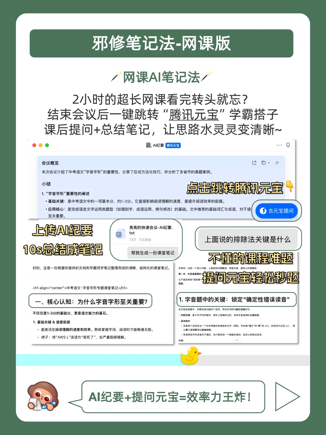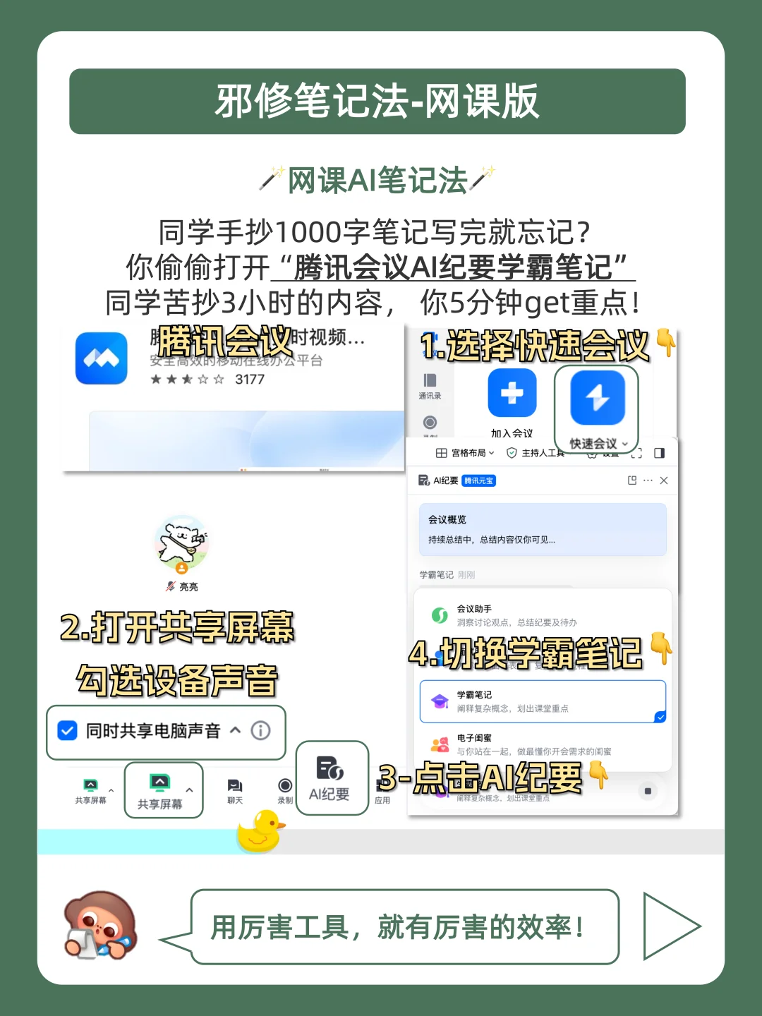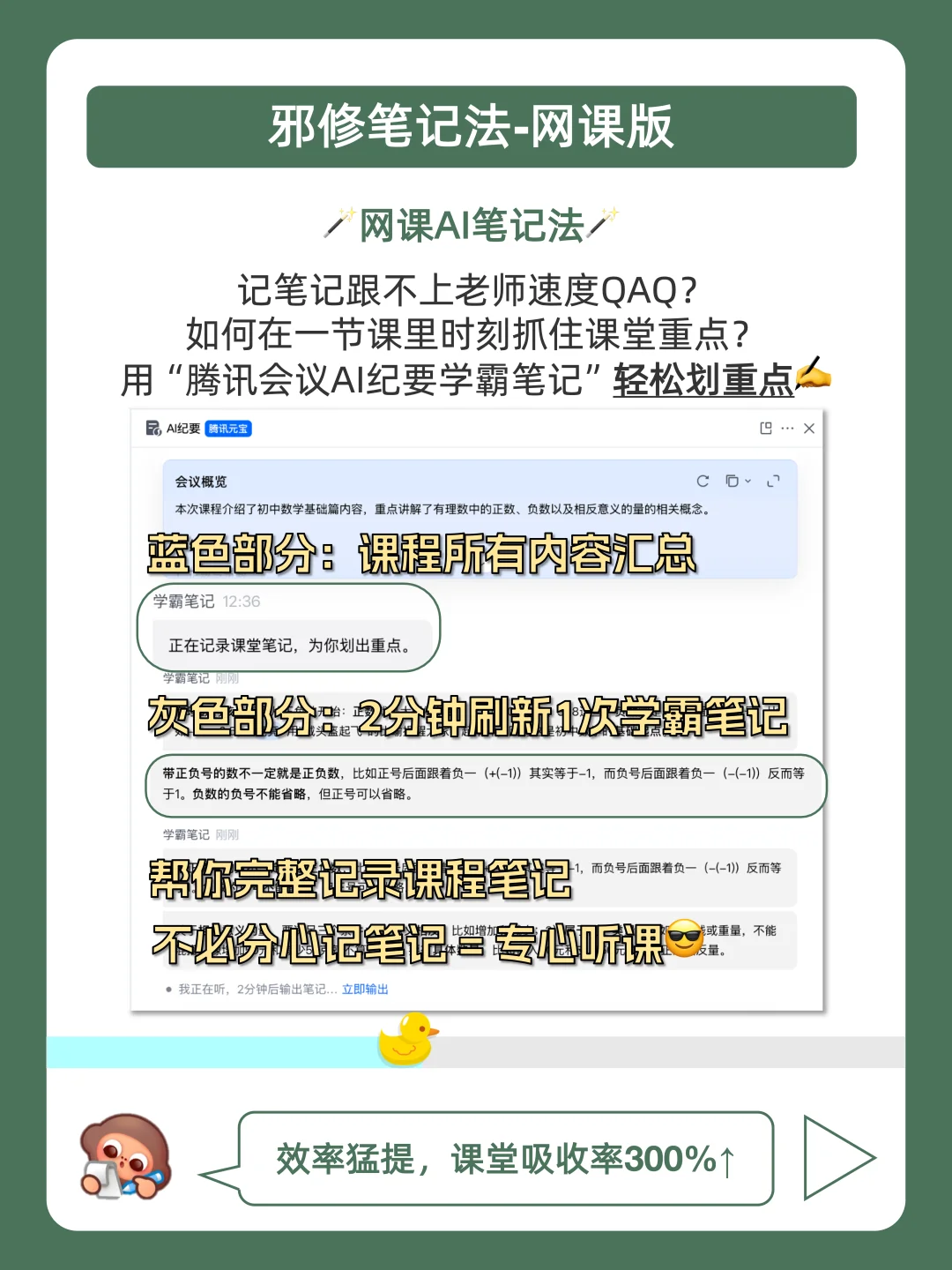👉想要成绩好,一定要学会“正确使劲儿”!除了平常课堂上认真学习,课后也可以多看看网课巩固知识点,扩充咱们的知识面!像学霸成绩这么好,他们都掌握了日常学习的“巧劲儿”! . 👉日常要学会用学习工具高效省力,事半功倍!网课老师讲课语速太快,而且关键要点超多,记笔记总是跟不上,只能来回拉进度条?可以试试“腾讯会议AI纪要新出的学霸笔记”~ . 👍打开腾讯会议,进入快速会议,选择AI纪要,切换学霸笔记,开启共享屏幕,勾选共享电脑屏幕声音,它可以2分钟实时记录网课内容,我们只需要专心听老师讲课,它的灰色部分每2分钟就会总结一次讲课重点,实现随时学习知识点不掉队了。 . 👉听完这节网课内容太多有点混乱,需要巩固这节网课知识点,直接一键跳转腾讯元宝,就能生成完整的课程总结,帮助我们理解课程重点,课后还是有不懂地方十分头疼?直接向学霸搭子元宝提问得到精准解答,学习效率暴涨300%实在太香了! . 🐣我是鸭鸭学长,持续分享更多学霸邪修学习法,陪宝子们学习开窍,考试开挂!