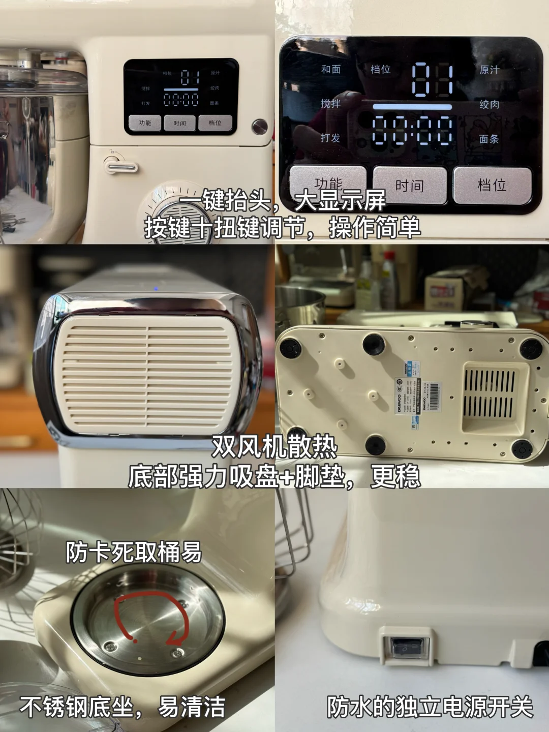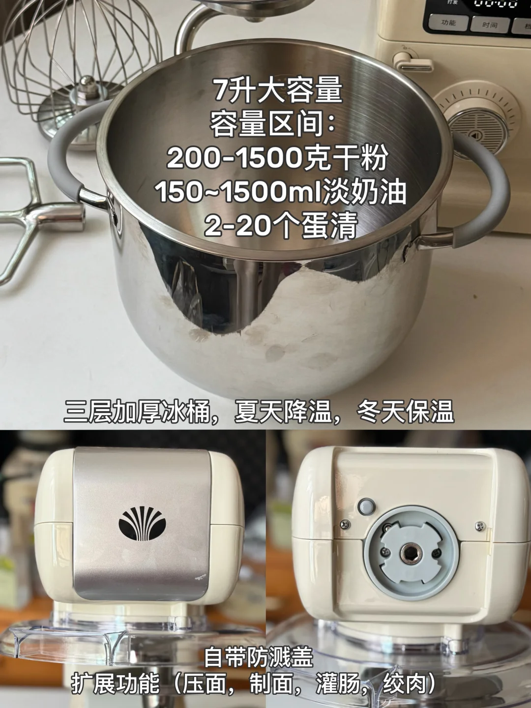 大白象厨师机功率大揉面出膜快,双风机散热,冰桶降温保温有效控制面温度。打发蛋白不仅快重点是稳定细腻,完全能抗住量大的私房。还有的扩展功能-绞肉|压面|制面|原汁|灌肠,能同时满足家用私房的需求。👍👍👍