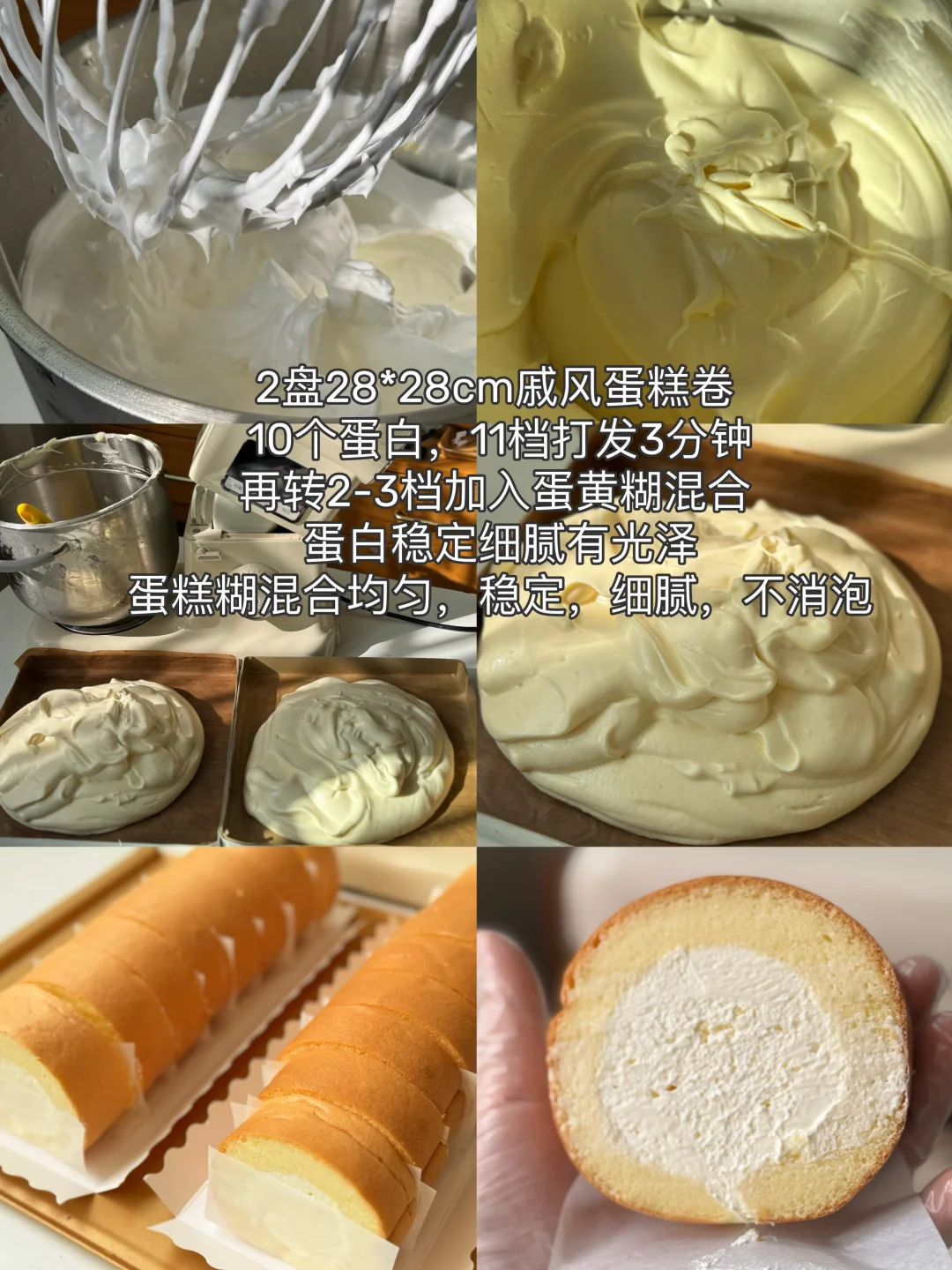 10个蛋白十柠檬汁十砂糖直接11档打发,2分30秒左右检查状态,我3分钟停下来,蛋白状态有细腻绵密有光泽,转2-3档从旁边倒入蛋黄糊,约1分钟,最后用刮刀抽底。蛋糕糊细腻,状态稳定,我分盘到烤等了8分钟左右,最后出炉的蛋糕卷没消泡,细腻,松软。