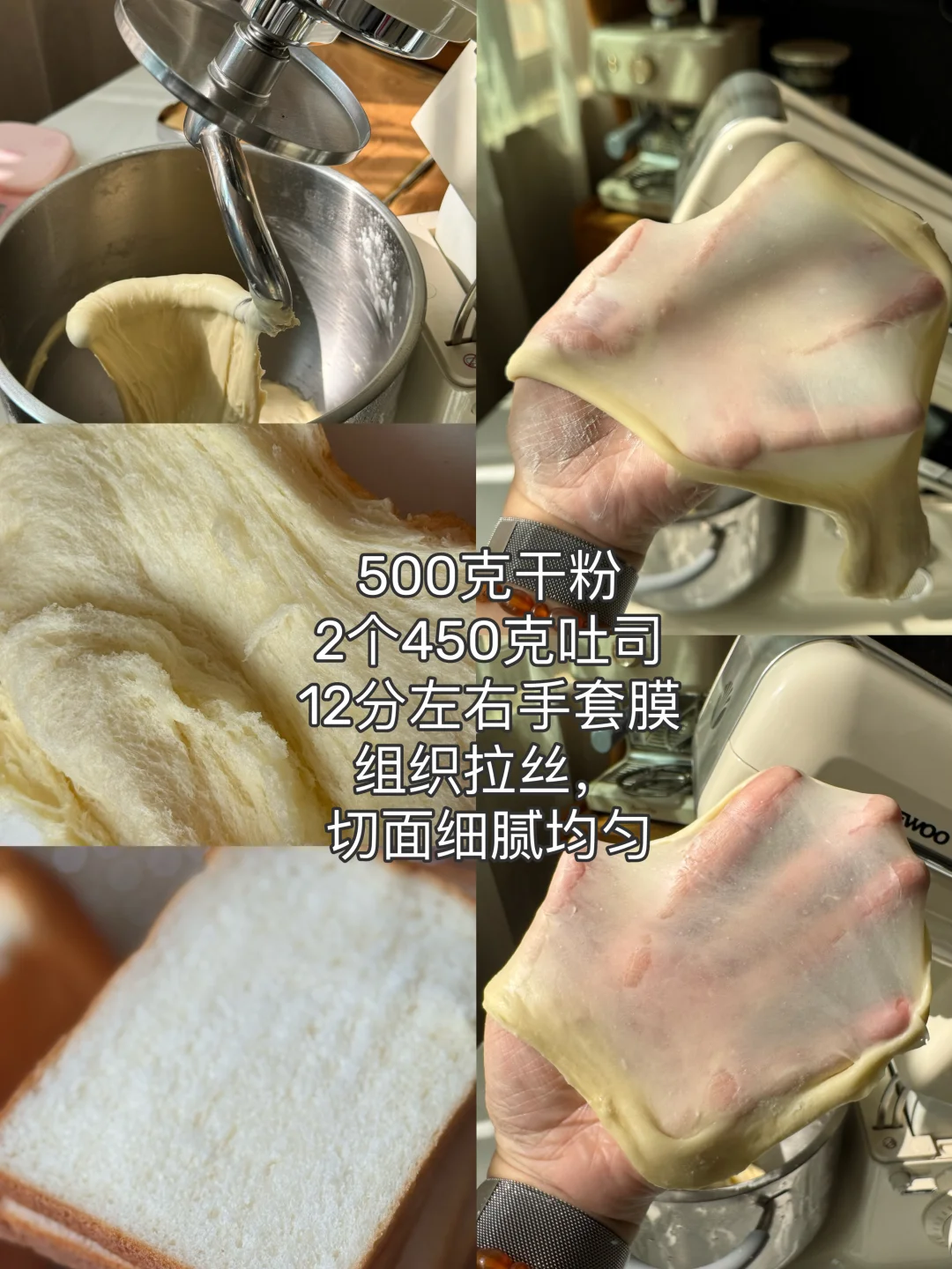 ✔️直接法,先除黄油盐和酵母外的材料,搅拌功能先2档转6档,8分钟左右出厚膜,再加软化黄油鲜酵母盐,先2档再6档,4分左右出手套膜。 当天室温28.5度,用的冷藏液体,最后面温是26度(不好意思忘了拍),撑起来的面团光滑,轻松撑出手套膜,延展性好。