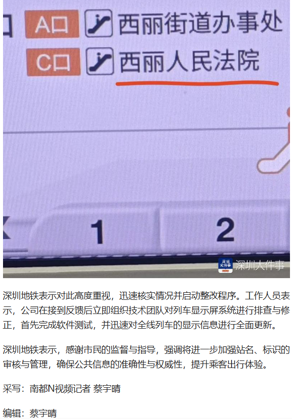 【:连夜整改,已完成全线更新】近日,有市民反映搭乘深圳地铁3号线列车显示屏上出现“西丽人民法院”的错误站名标识,引发网络关注。对此,深圳地铁迅速回应,表示已连夜开展修改工作,并将迅速完成全线列车的更新。11月12日,南都N视频记者向深圳地铁了解到,列车已完成标识更新。据了解,有乘客在乘坐3号线时发现,列车动态地图中将“西丽人民法庭”误标为“西丽人民法院”。该名乘客提到,“法院”与“法庭”虽一字之差,但在法律意义上具有明确区别,公共场所的标识应准确规范,避免误导。