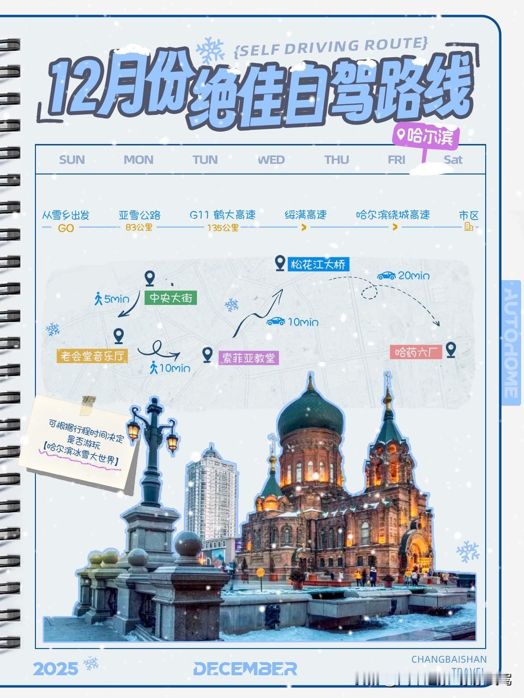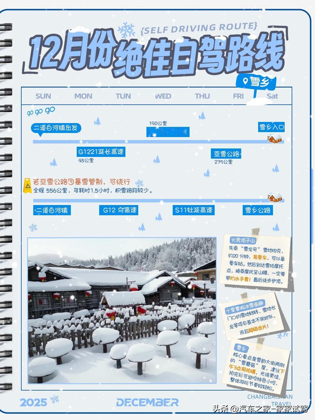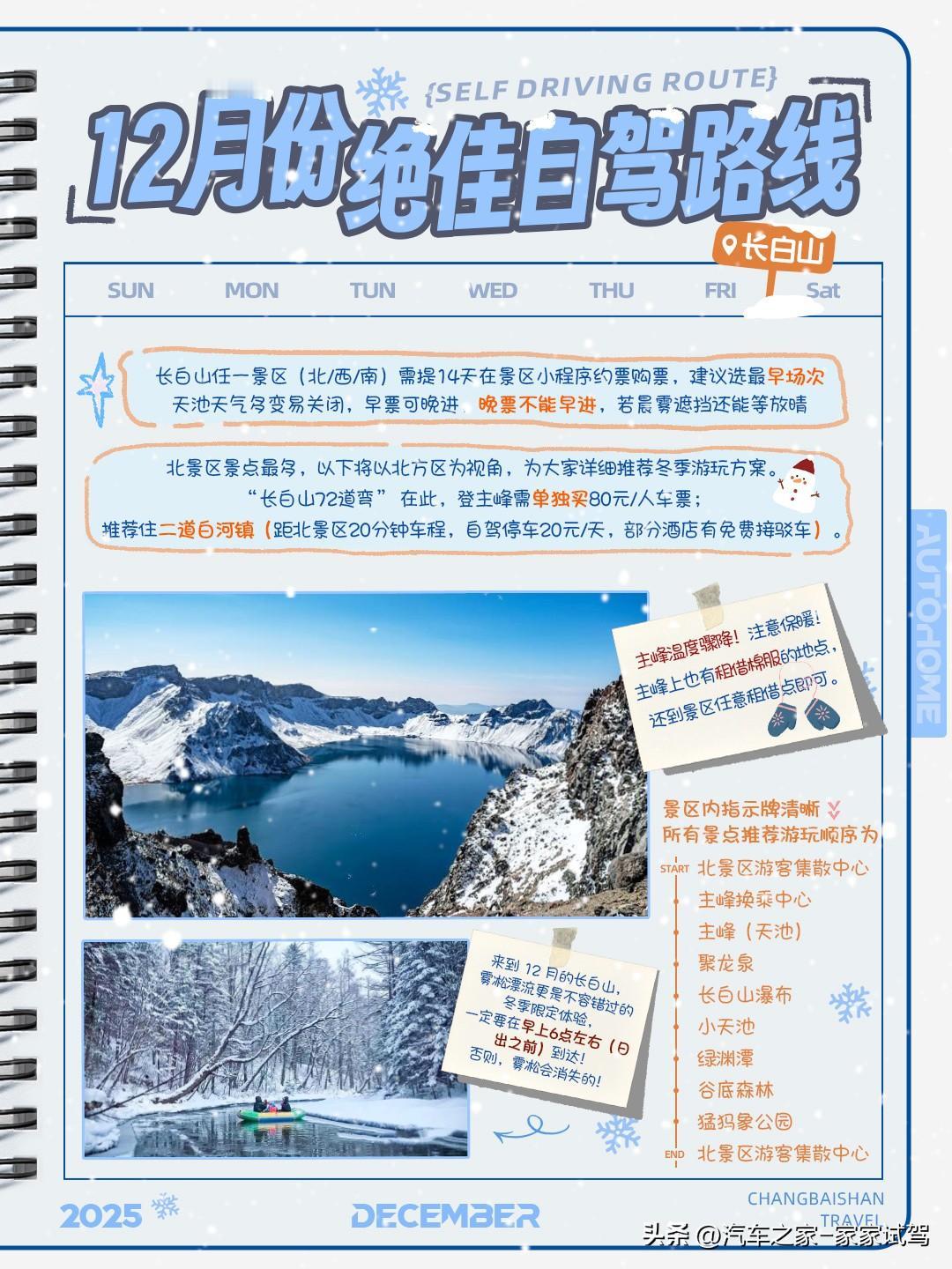 12月份绝佳自驾路线来咯!这次家家准备的路线地点一样,游玩顺序不一样,各有优势,快来和家家一起了解一下吧! 顺序关键原因在于—— 若你选择12月中下旬出行,那么家家推荐长白山→雪乡→哈尔滨,这样反向走能打卡到哈尔滨冰雪大世界,此时冰雕景观已开始呈现; 若你选择12月初出发,冰雪大世界尚未完全开放,则可按哈尔滨→雪乡→长白山的常规顺序游玩,能够逐步适应寒冷气候。 一、长白山 长白山任一景区(北/西/南)需提14天在景区小程序约票购票,建议选最早场次 —— 天池天气多变易关闭,早票可晚进,晚票不能早进,若晨雾遮挡还能等放晴。 北景区景点最多,以下将以北方区为视角,为大家详细推荐冬季游玩方案。 “长白山72道弯” 在此,登主峰需单独买80元/人车票;推荐住二道白河镇(距北景区20分钟车程,自驾停车20元/天,部分酒店有免费接驳车)。 景区内指示牌清晰,所有景点推荐游玩顺序为 北景区游客集散中心→主峰换乘中心→主峰(天池)→聚龙泉→长白山瀑布→小天池→绿渊潭→谷底森林→猛犸象公园→回到北景区游客集散中心。 主峰温度骤降!注意保暖!主峰上也有租借棉服的地点,还到景区任意租借点即可。 来到 12 月的长白山,雾凇漂流更是不容错过的冬季限定体验,一定要在早上6点左右(日出之前)到达!否则,雾凇会消失的! 二、雪乡 从二道白河镇出发,上G1221延长高速(45公里)→G11鹤大高速(190公里)→亚雪公路(235公里)→到达雪乡入口 若亚雪公路因暴雪管制,可绕行:二道白河→G12 乌高速→S11牡延高速→雪乡公路,全程 556公里,多耗时 1.5小时,积雪路段较少。 雪乡有3个必打卡的项目! ①大秃顶子山 先乘 “雪龙号” 雪地坦克,约20 分钟,易晕车,可以备晕车贴。然后到达雪地摩托点,换乘摩托至山腰,一定要带防水手套!最后徒步登顶。 ②十里雾凇冰雪画廊 门口的雪地转转、雪地长龙等项目基本不用排队,而且超级出片! ③雪乡 核心看点是雪韵大街两侧的 “雪蘑菇” 屋,建议下午3点前拍摄,光线更佳,拍完后可逛吃特色小吃,整体游玩节奏较轻松。 三、哈尔滨 从雪乡出发→亚雪公路(83 公里)→G11 鹤大高速(135 公里)→绥满高速→哈尔滨绕城高速→市区。 从【中央大街】步行五分钟至【老会堂音乐厅】再步行十分钟至【索菲亚教堂】,驾车10分钟游览【松花江大桥】,接着再驾驶20分钟到达【哈药六厂】。 可根据行程时间决定是否游玩【哈尔滨冰雪大世界】。