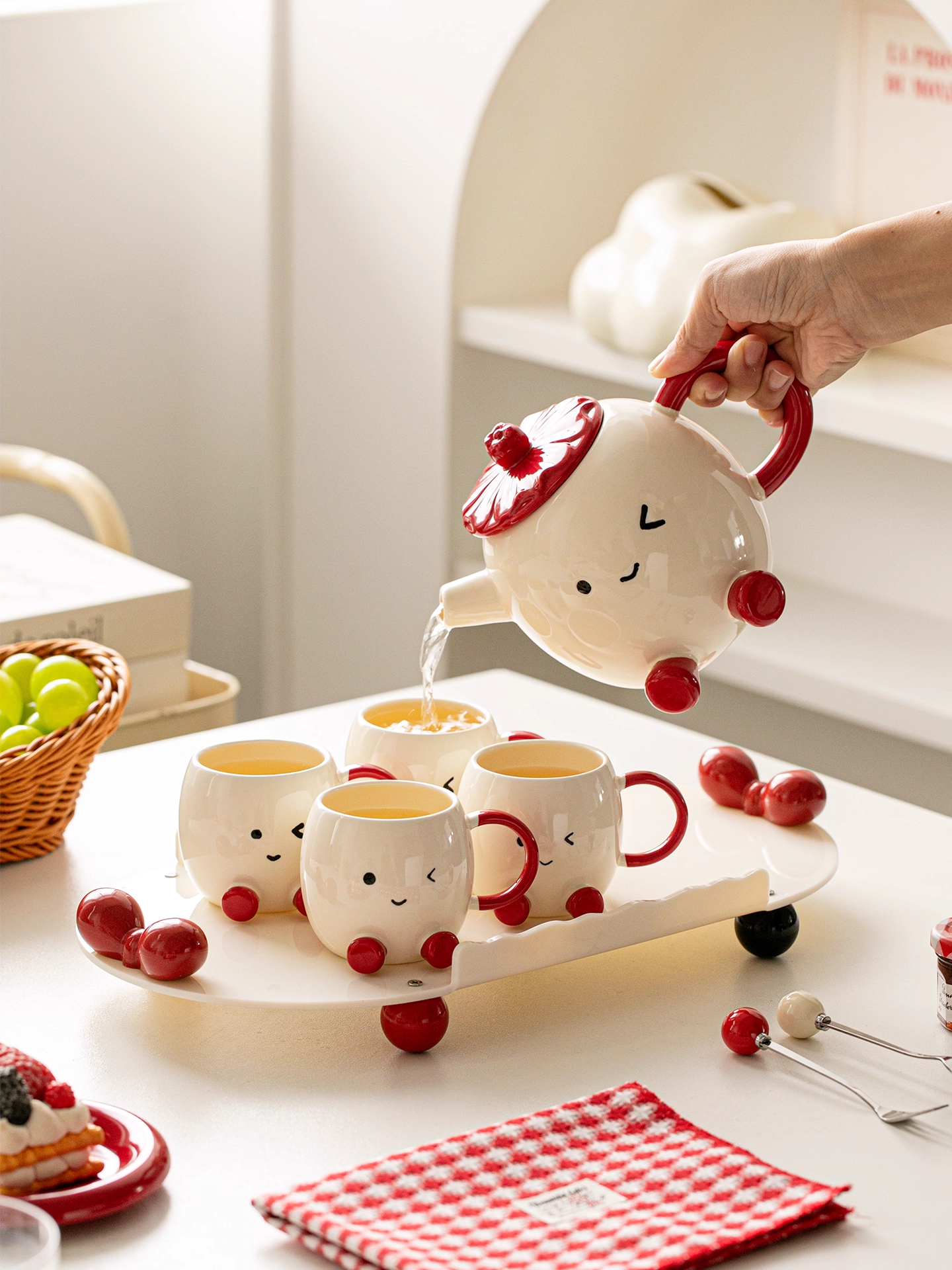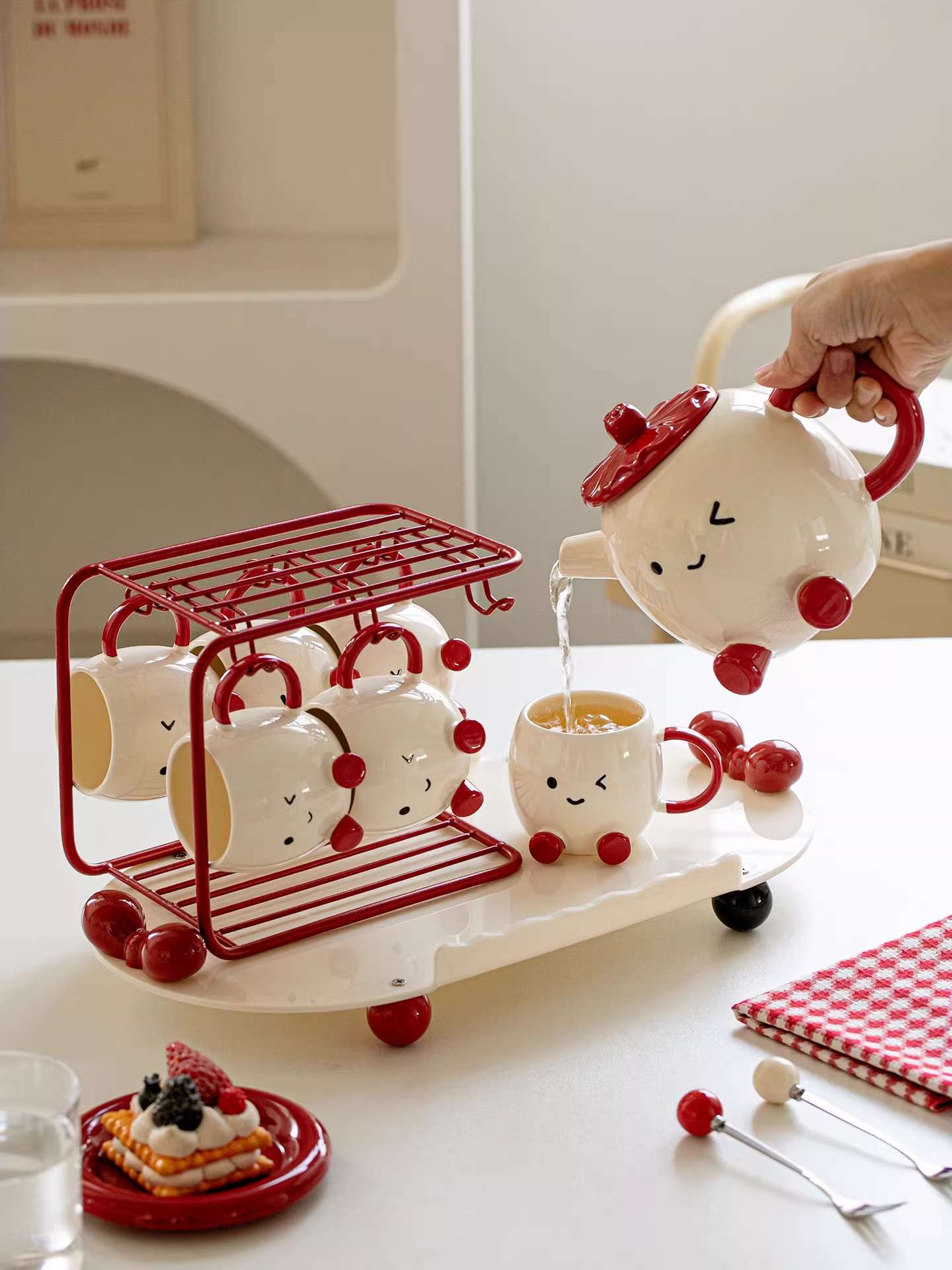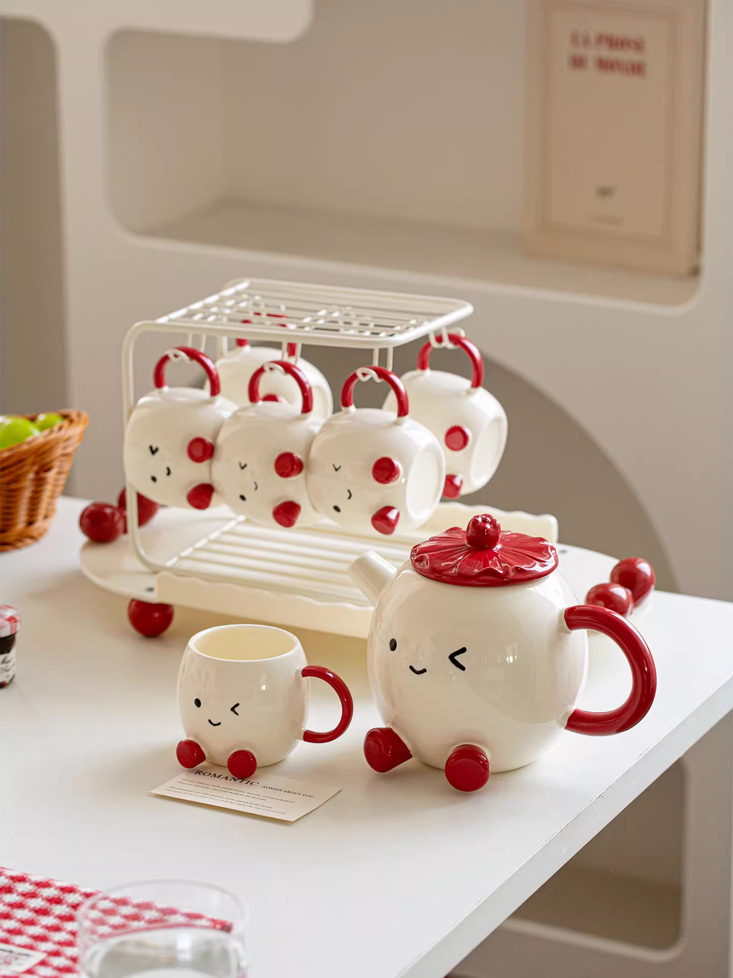 这套茶具尊嘟可爱爆啦第一眼就被萌到了茶壶和杯子都长着圆圆的脸,还有红红的小jio jio