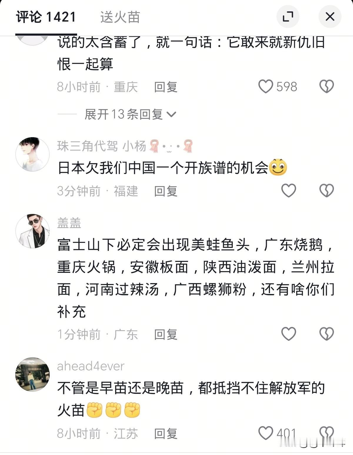 有网友说: “打台湾,中国老百姓还要犹豫一下,打日本,丝毫不会犹豫!” 朋友来了有好酒,豺狼来了有猎枪。对这个曾经给我们带来巨大伤痛的民族,只要他敢将手伸进来,必然被“斩首”!
