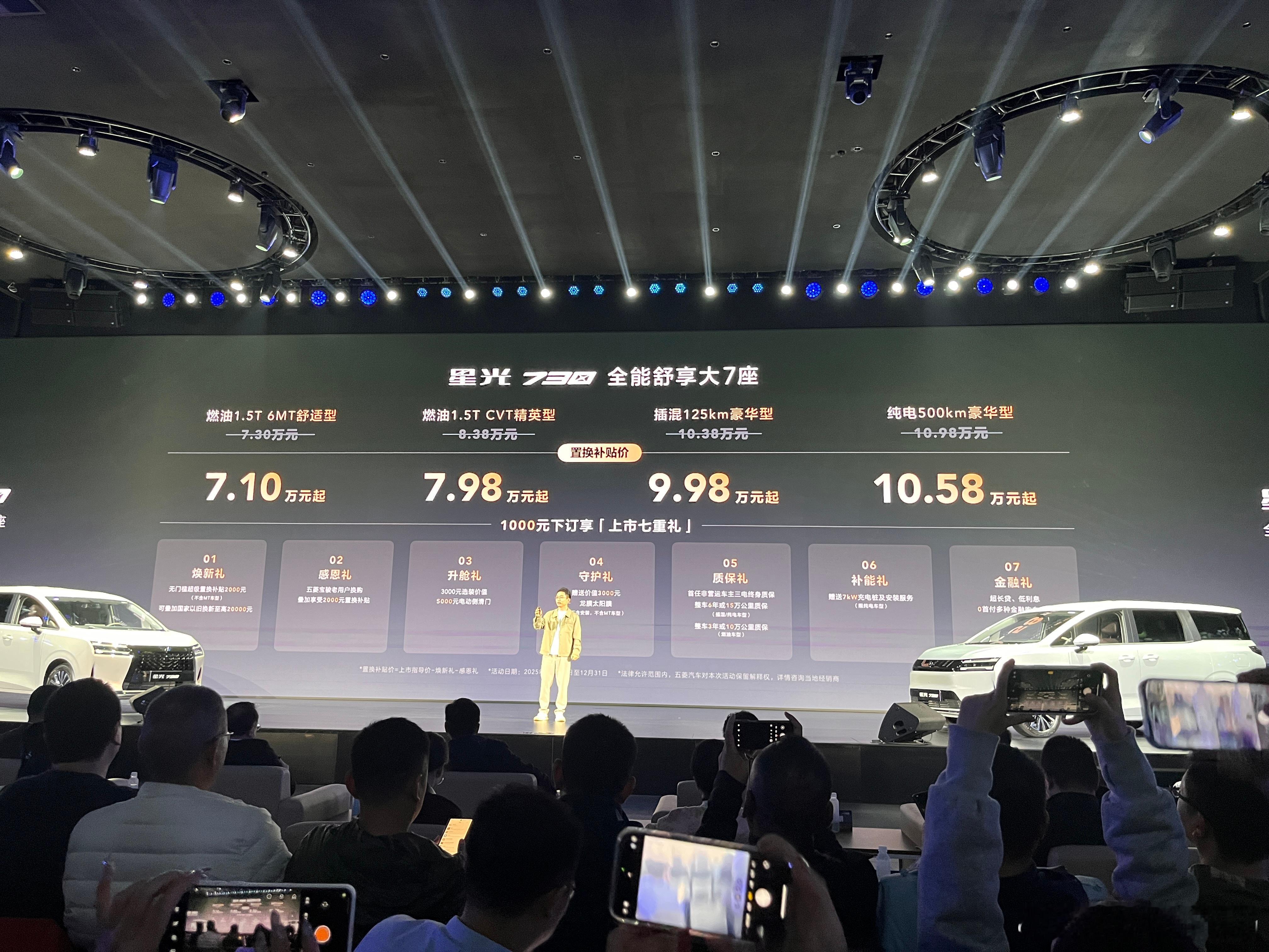 11月12日晚,星光730正式上市,定位大7座MPV,一车三动力,共4个车型版本。官方指导价区间覆盖7.30-10.98万元,置换补贴后售价区间覆盖7.10-10.58万元。1.【动力双认证加持】插混车型搭载灵犀动力3.0,荣获“2025年度中国心十佳发动机及混动系统”,以及“中汽中心高品质混动的双认证”,动力性能有保障。2.【越级标配滑移门】全系标配双侧重力滑轨滑移门,这项以往高价MPV才有的配置,如今出现在10万级以内的MPV车上可享,有点惊人。3.【4米9大空间能装】4910x1850x1760,值得注意的是作为车身长达非5米的MPV,三排空间却并不拥挤。五菱品牌代言人王祖蓝携老婆李亚男亲临现场见证,现场演示可装下10个【王祖蓝】及12个行李箱。4.【全球车型已出海】作为全球车,星光730已在印尼正式上市,践行五菱“不只做中国的五菱,还要做世界人民的五菱”的品牌理念。5.【家庭出行超友好】配备4个儿童座椅接口,对全家出行、有娃家庭以及二胎家族十分友好。6.【电池安全有保障】搭载神炼电池,依托300万新能源销量背书,碰撞自燃0记录,提前满足新国标。