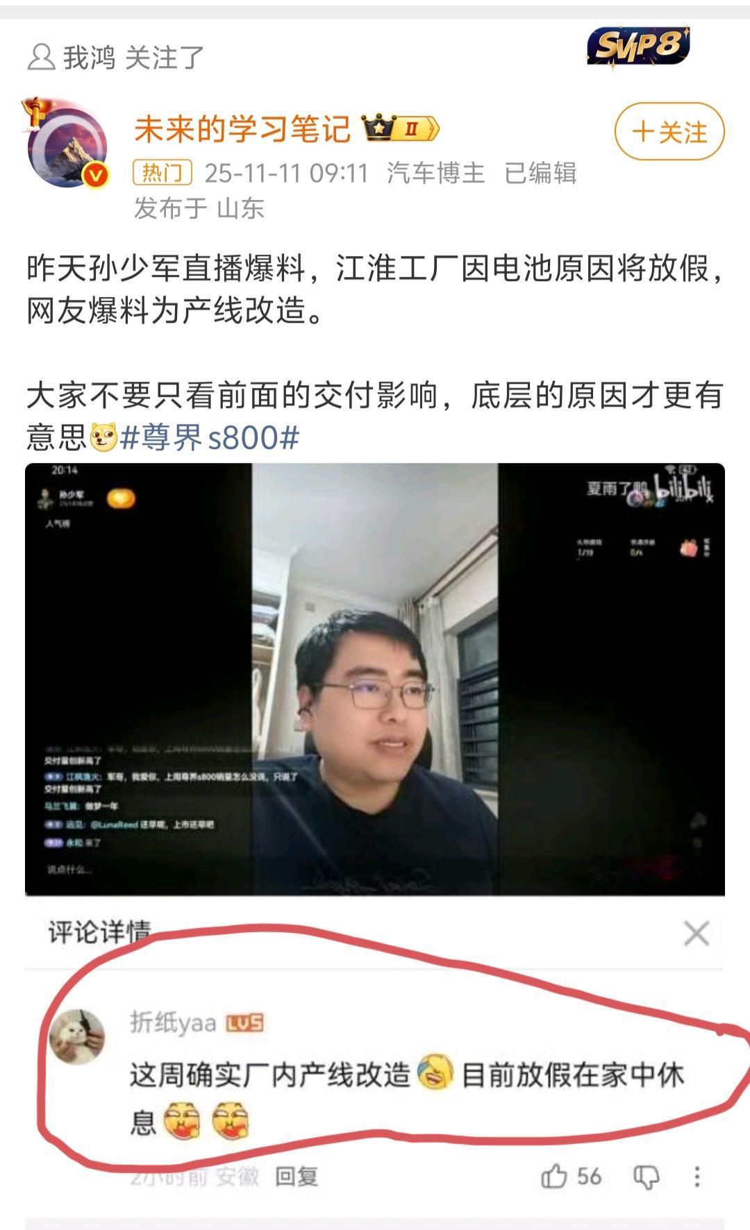 余承东压力山大啊,一边是尊界不断增长的订单速度,一边是江淮尊界产线的停产改造,供需平衡的难度又加码了。 博主孙少军在直播间爆料说,尊界因为电池供应不上,当前正在放假进行产线改造升级。评论区里有尊界超级工厂的员工也证实,这周厂里确实正在进行产线改造,他目前正放假在家里休息。 一边是用户纷纷在线催交付的压力,一边是产线升级按下的暂停键,这供需的“跷跷板”确实不好平衡啊!不过,磨刀不误砍柴工,产线改造都是为了后续提升产能,毕竟当前尊界S800的月产能只有约4500台,远低于累计1.5万+的订单量。 希望改造完能更快把车交到用户手里吧,不要欠车过年了。余承东 华为尊界汽车 尊界销量 尊界S800