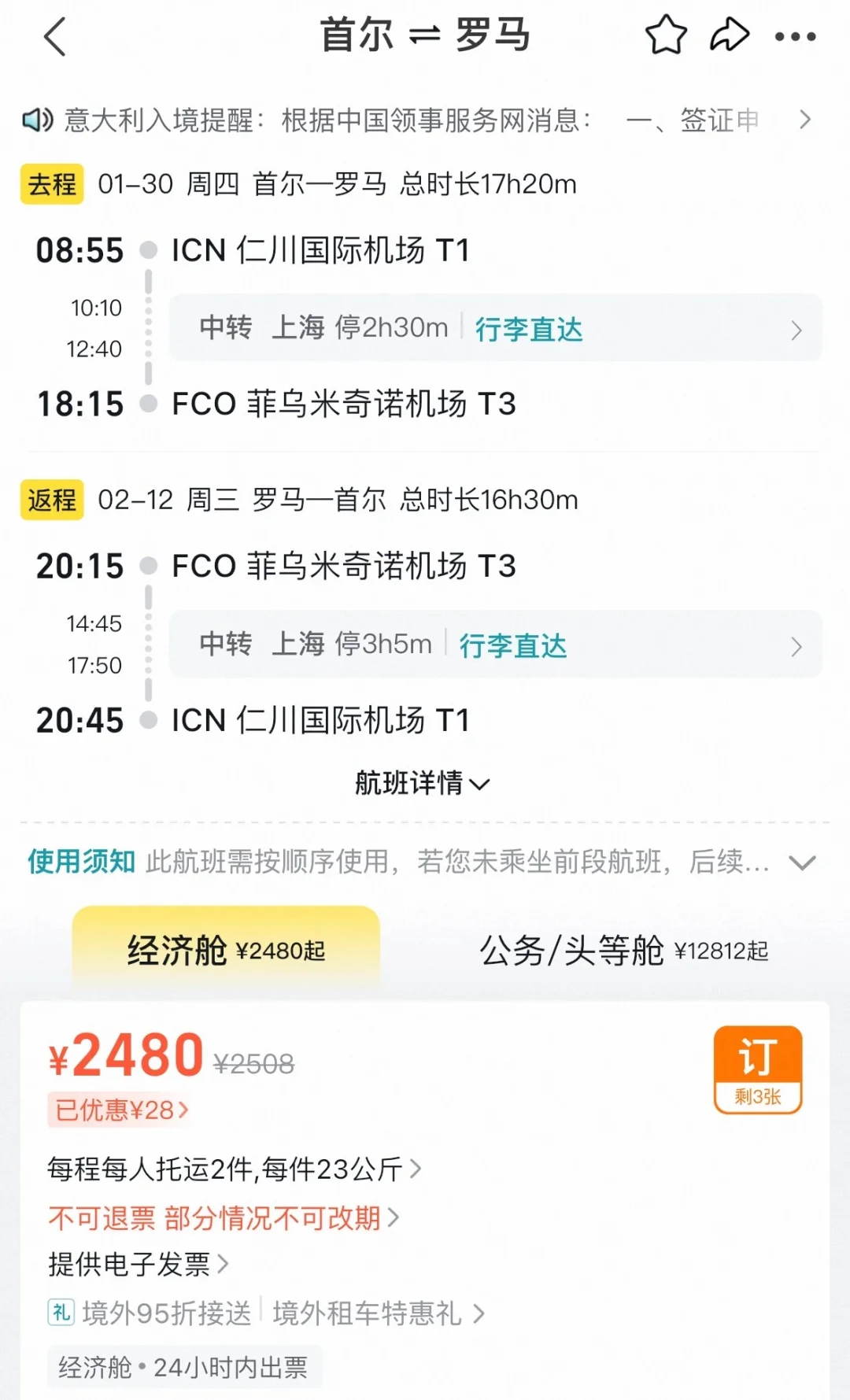 春节要来了!博主也在一直找合适的机票出行! 今天发现了这样一条羊毛路线!韩国首尔出发经过上海中转飞意大利罗马含税只要2.4K! 回程如果没有托运的话可以在上海下飞机! - 本人只做羊毛信息的分享,如有诉求请自行搜索哦!