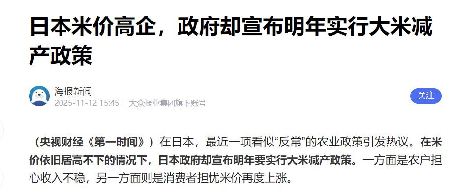 快讯,快讯 日本突然宣布 11月12日消息,日本农林水产省宣布2026年度主食用大米产量目标定为711万吨,比2025年减少约37万吨,可眼下日本5公斤大米零售均价已达4235日元(约合人民币200元),部分新米售价更是超过5000日元,这操作简直是雪上加霜。 要知道 2024 年这时候,同样一袋米才 2228 日元,一年光景就翻了快一倍,涨幅达到 98.4%,创下 54 年来的新高,这哪是涨价,简直是抢钱。 就说东京那位佐藤太太吧,家里老两口带个小孙子,以前每月买米也就花 8000 日元,现在得掏 1 万 6,退休金就那么点,省下的钱只能从菜钱里抠,以前顿顿有米饭,现在都得掺点杂粮,孙子想吃白米饭都得算计着来。 有人可能问,产量少了才涨价,怎么还敢减产?日本政府说什么人口减少、大家吃得杂了,大米需求降了,减产是为了避免过剩、稳住农民收入。 这话纯属睁眼说瞎话,2025 年日本大米自给率都跌破 93% 的警戒线了,以前几乎能自己供自己吃,现在越来越不够了,连 “日本粮仓” 北海道去年都得从泰国、越南紧急买米,这哪是需求降了,明明是不够吃了。 更要命的是,现在全国储备米就剩 15 万吨,顶多够吃一个月,之前政府放了 41 万吨储备米,结果 7% 都没流到零售市场,全被农协囤积起来了,这哪是稳供应,分明是故意抬价格。 要说这事得怪日本政府几十年的糊涂政策。上世纪 70 年代起,他们就说大米过剩,让农民把水田改种小麦、大豆,改种就给补贴,这政策一搞就是几十年。 静冈县那个叫宫本纯的种田大户,手里 25 公顷稻田年产 120 吨稻谷,算是当地的佼佼者了,可他说自己这几年几乎年年亏本,现在 5 公斤米卖 4000 多日元,才刚够覆盖肥料和农机维护的成本。 为啥这么难?因为种稻的成本涨得太凶,农机用的钢铁塑料全靠进口,日元贬值后,船运和燃料价上去了,农机价格涨了 20% 到 30%,肥料农药更别提了,成本蹭蹭涨,卖价再高农民也赚不到钱。 更揪心的是没人种地了,宫本纯 50 多岁,在村里居然是最年轻的稻农,全村七成以上的稻农都超过 70 岁,还有九十多岁的老人在地里忙活。年轻人谁愿意干这亏本的营生? 2024 年申请破产的稻农数量创了 10 年来的新高,再过十年八年,能种地的人更少了,有专家说那时候 5 公斤米可能要卖到 1 万甚至 2 万日元,想想都吓人。 四个月前政府还喊着要增产,转头就说要减产,政策变得比翻书还快,农民都被搞糊涂了,想种不敢种,不种又不行,这不是折腾人吗? 中间还有猫腻呢,日本大米流通要经过好多中间商,一层一层转手加价,最后全加到消费者头上。神户松荫大学的教授都说,批发商转得越多,价格涨得越狠,这就是明目张胆的垄断。 农协还跟自民党勾着,农协能动员选票,自民党就给政策优惠,形成了所谓的 “政 — 官 — 农” 三角,他们只顾着自己赚钱,哪管老百姓吃不吃得起米。 现在可好,米价已经高得离谱,政府不想着怎么鼓励农民多种地、降成本、打击垄断,反而要减产,这不是往火坑里添柴吗? 老百姓手里的钱越来越不值钱,买米的开销翻番,日子过得紧巴巴;农民种稻不赚钱,没人愿意接班;餐馆小店扛不住成本倒闭,就业更难了。 这操作哪是为民生着想,分明是不管老百姓死活,照这么下去,日本的 “米荒” 只会越来越严重,老百姓的日子也只会越来越难,这雪上加霜的事儿,真是让人越想越气!