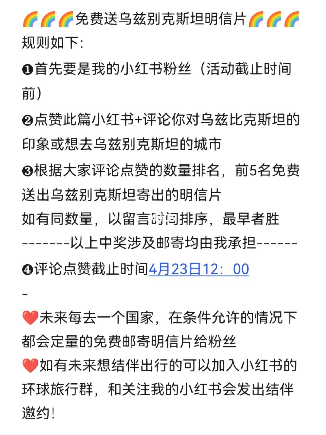 ✈️本人于4月28日到达乌兹比克斯坦,呆8天的时间游玩四个城市,前面的文章已经提过,会在活动截止前(4.23中午)按照点赞数,免费从乌兹别克斯坦撒马尔罕或其他城市邮局邮寄明信片给粉丝们!(若有意外,会带回国给大家邮寄)