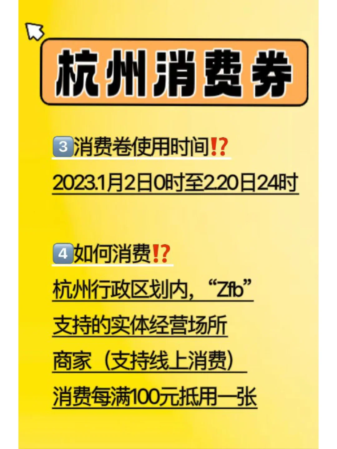 杭州行政区划内,“Zfb”支持的实体经营场所商家(支持线上消费),消费每满100元抵用一张。