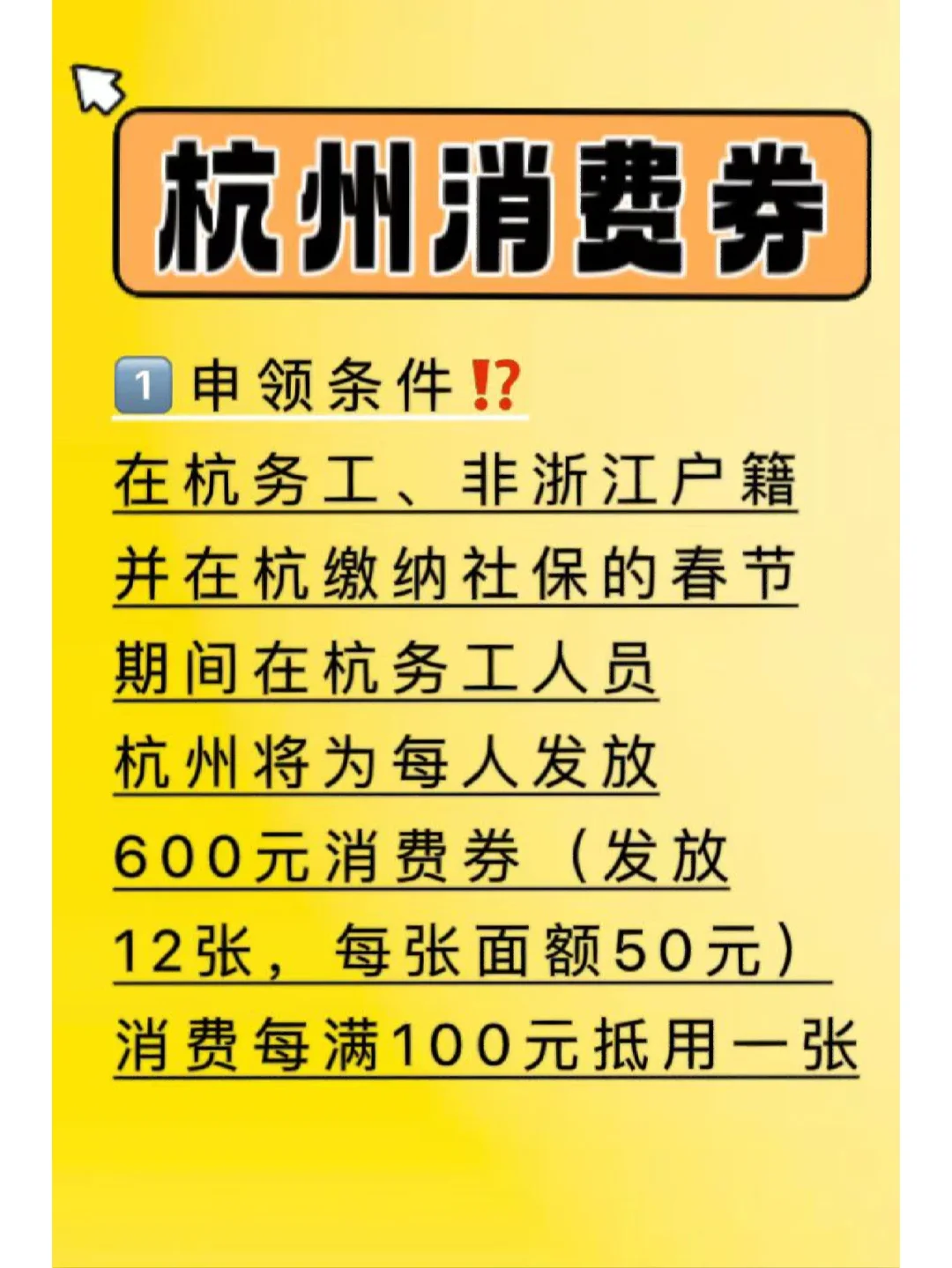 杭州将为每人发放600元消费券(发放12张,每张面额50元),消费每满100元抵用一张。