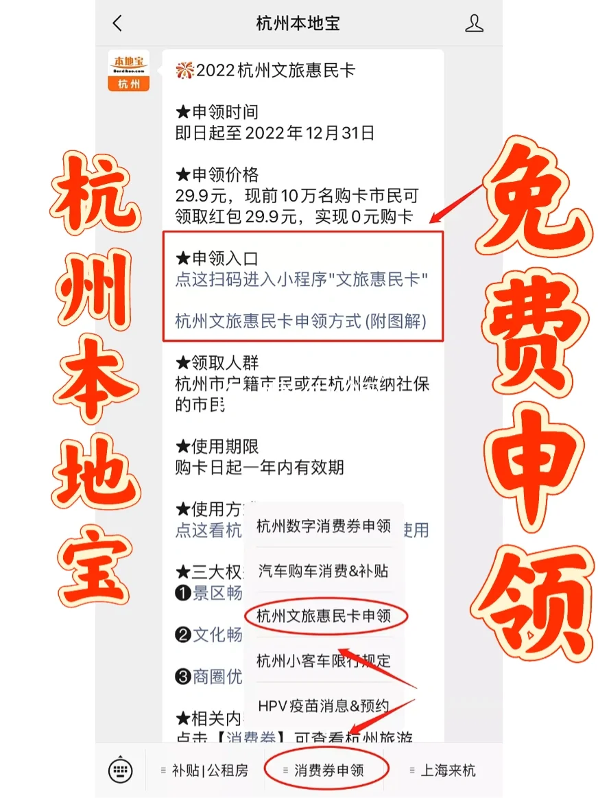 ✨申领入口:公众号(杭州本地宝)➡️点击首页菜单栏➡️消费券申领➡️杭州文旅惠民卡申领!即可获取领取入口/图文教程。