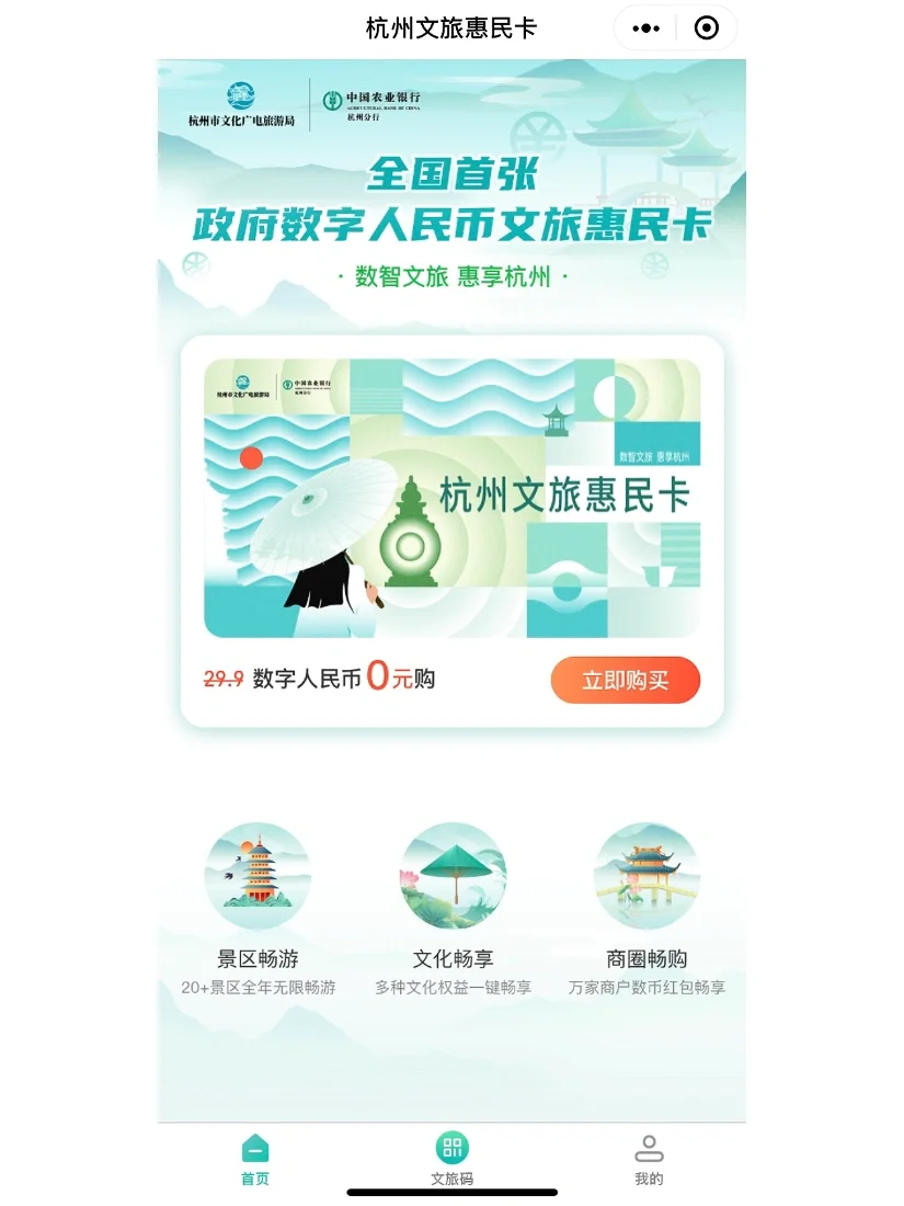 [飞吻R]免费申请杭州文旅惠民卡‼️杭州部分景点免费畅游!注意⚠️:前10万人将享受0元购卡‼️