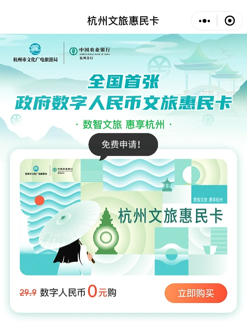 3⃣️VX小程序:杭州文旅惠民卡🔜0元购卡🔜下载数字人民币app🔜升级三类钱包🔜付款0元,就可以啦~