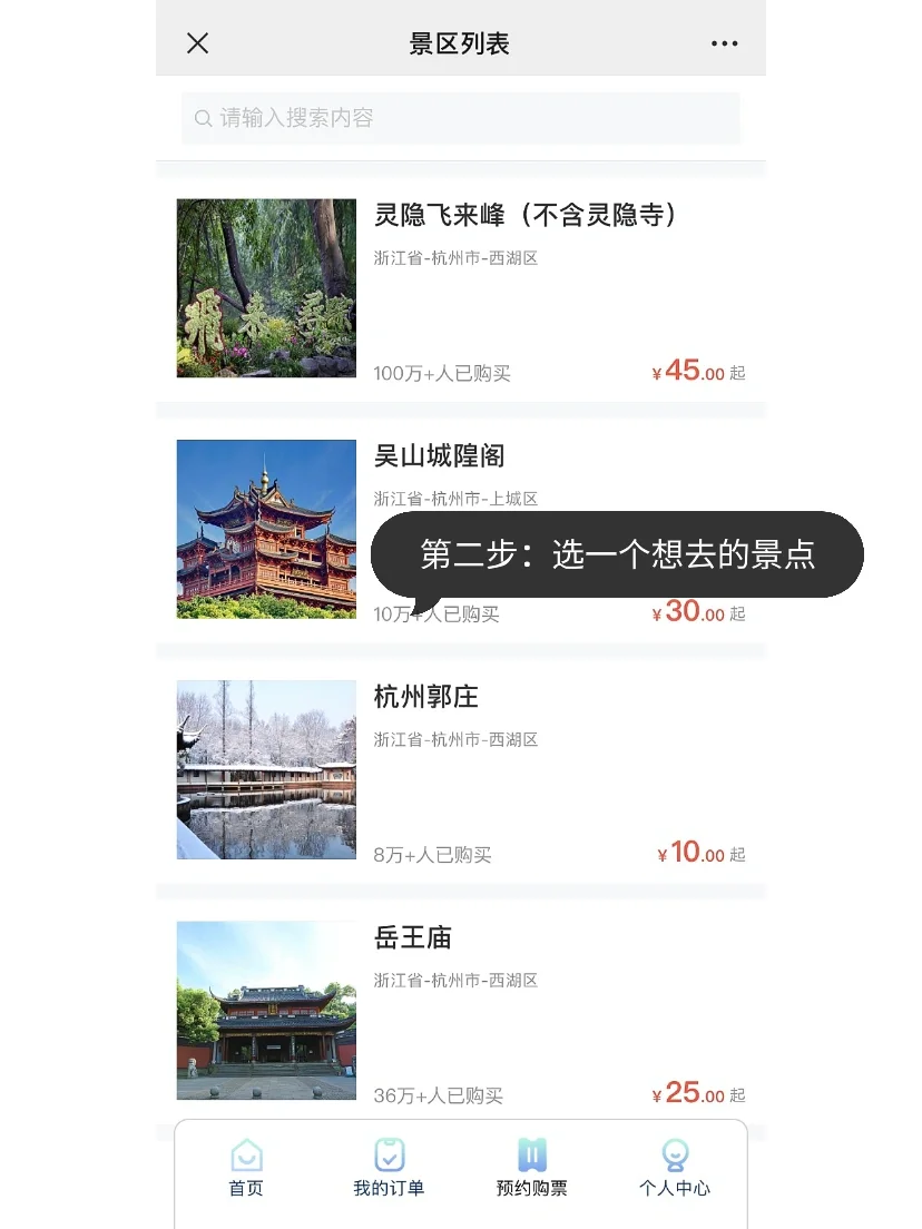 即动物园、植物园、木兰山茶园、飞来峰(不含灵隐寺)、郭庄、岳庙、黄龙洞、钱王祠、六和塔公园(不含登塔)、虎跑公园、云栖、城隍阁、玉皇山、万松书院、少儿公园、胡雪岩故居及西溪湿地共17个收费景点。对所有游客免收门票。