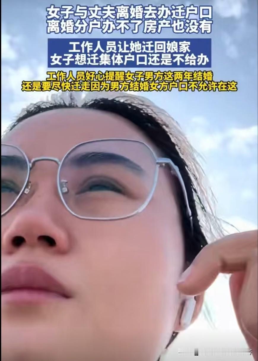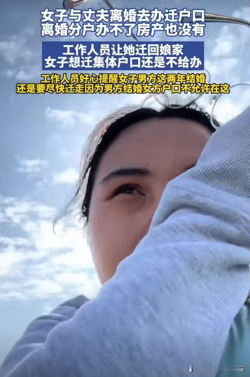 女子与丈夫离婚去办迁户口 离婚分户办不了 房产也没有。 有网友表示:说结婚后为了方便办事,就得把户口从娘家迁走的,我不理解!结婚本来就常期离开父母了,还不愿意趁办点事回娘家看看父母吗?我和父母还有我女儿一个户口,我老公跟他爸妈。 我结婚没迁户口,但是需要和村里签一份保证,村里的任何分红利益,都不能参与。 没那么好的事情吧,现在让我迁回娘家我同意啊,有征收补偿了。离异没房产一般都是迁到集体户去。 大家怎么看这事儿呢?欢迎评论区留言讨论!