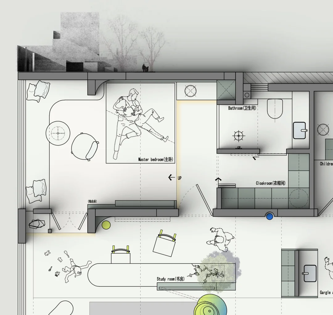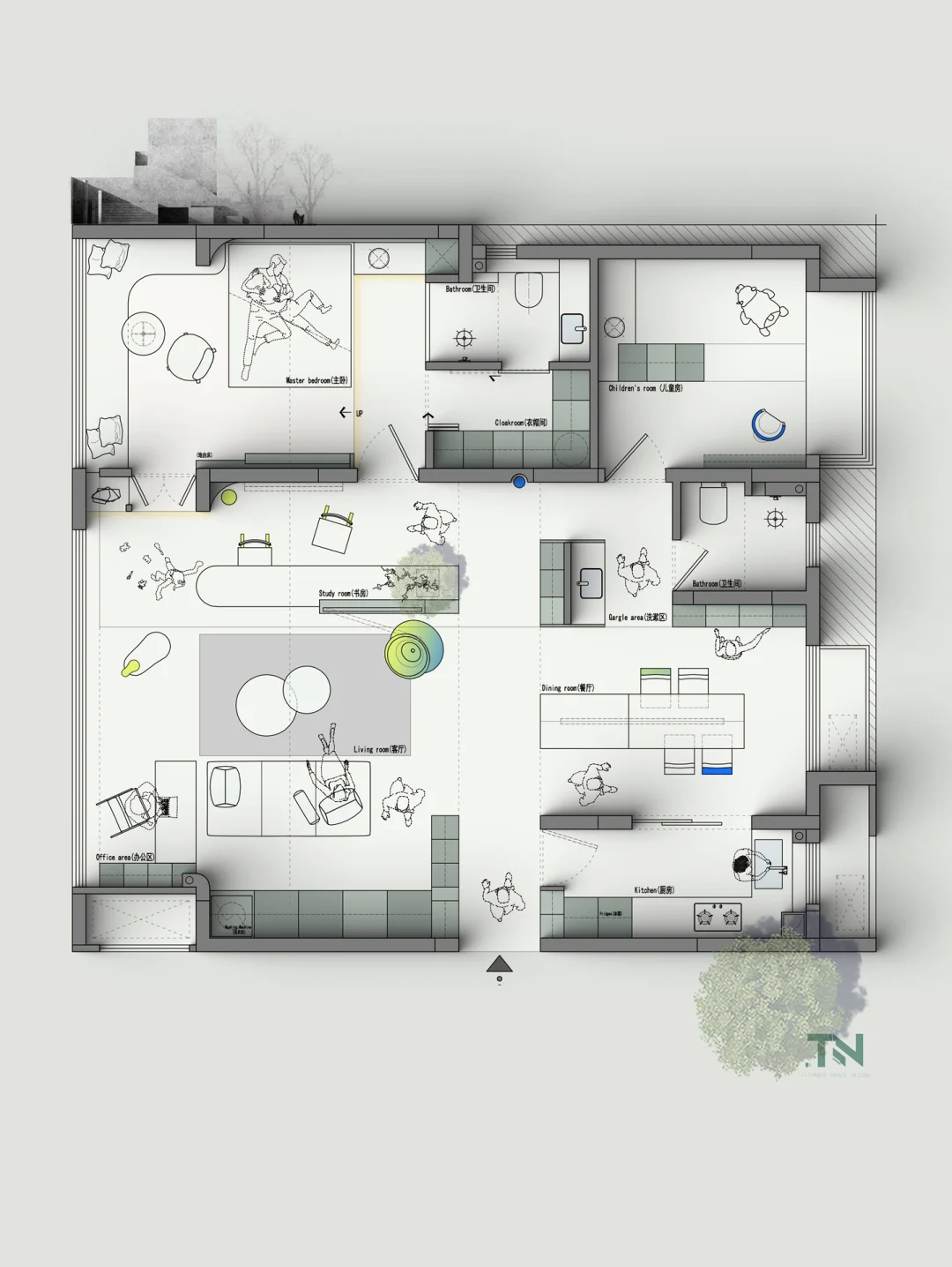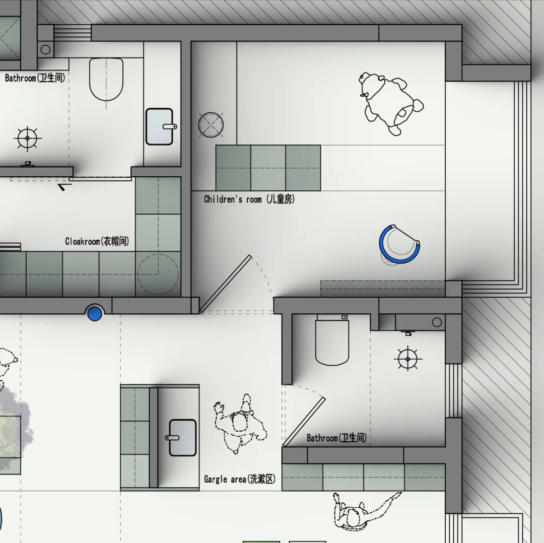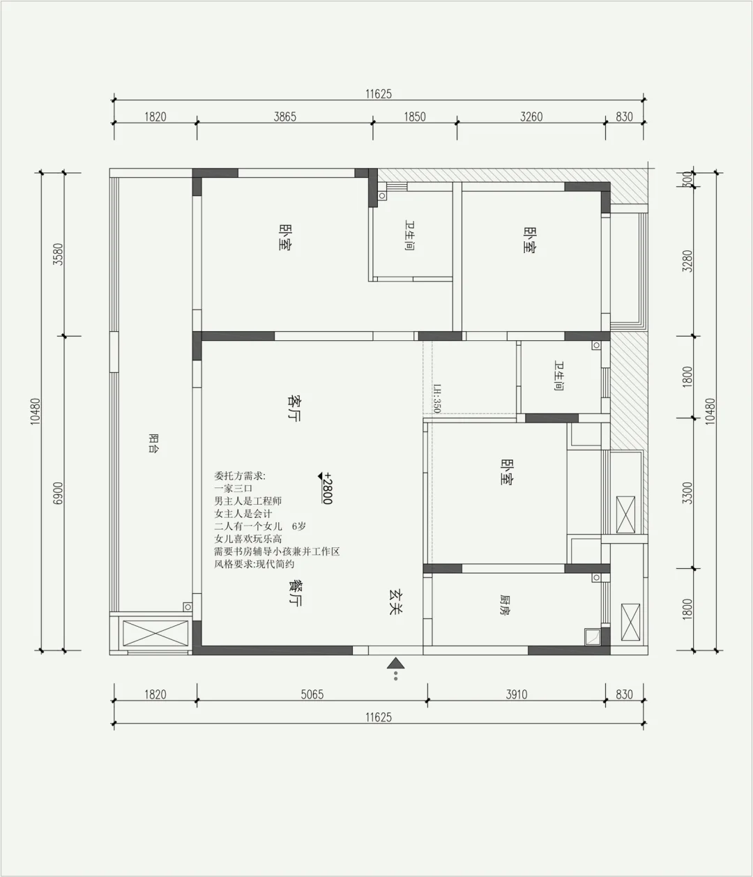 设计需求: 1、一家三口(男主人工程师,女主人会计,女儿) 2、客厅需要开阔空间,孩子的玩耍区(女儿喜欢乐高) 3、餐厅最好能有中岛台,长桌 4、书房(能和孩子一起学习,有单独的工作区) 5、主卧最好能有衣帽间,最好也要有工作台(男女主人都希望有自己的工作台) 6、儿童房趣味性点