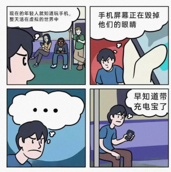 现在的年轻人就知道玩手机,整天活在虚拟的世界中,手机屏幕正在毁掉他们的眼睛。下一秒:早知道带充电宝了。