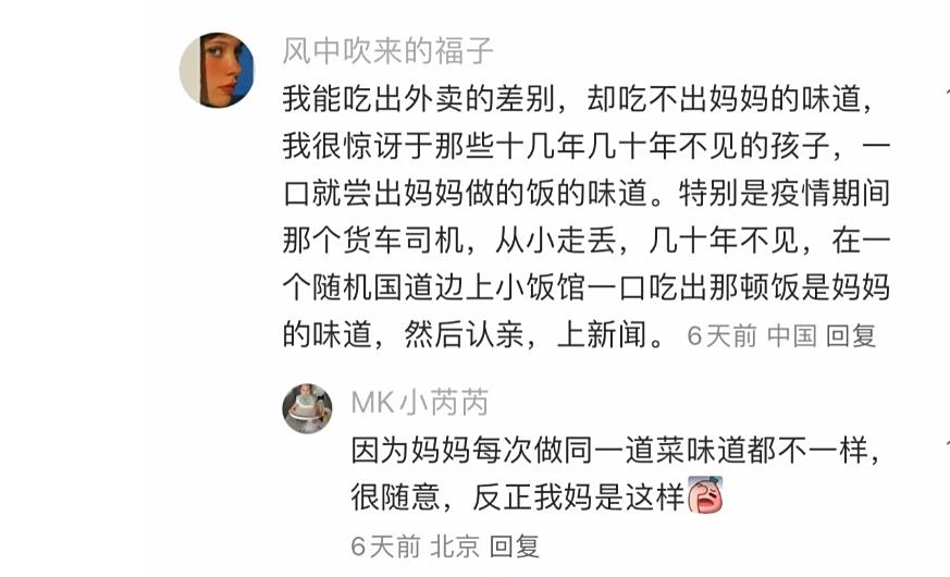 我妈炒的炝锅土豆丝永远是黏糊糊的,带几粒花椒,从小到大一直是那个味非常好吃,我丈母娘炒的土豆条也是具有特色,切的大拇指那么粗,跟吃薯条一样,我要是丢了十几年我也能靠这俩菜认出我这俩妈。