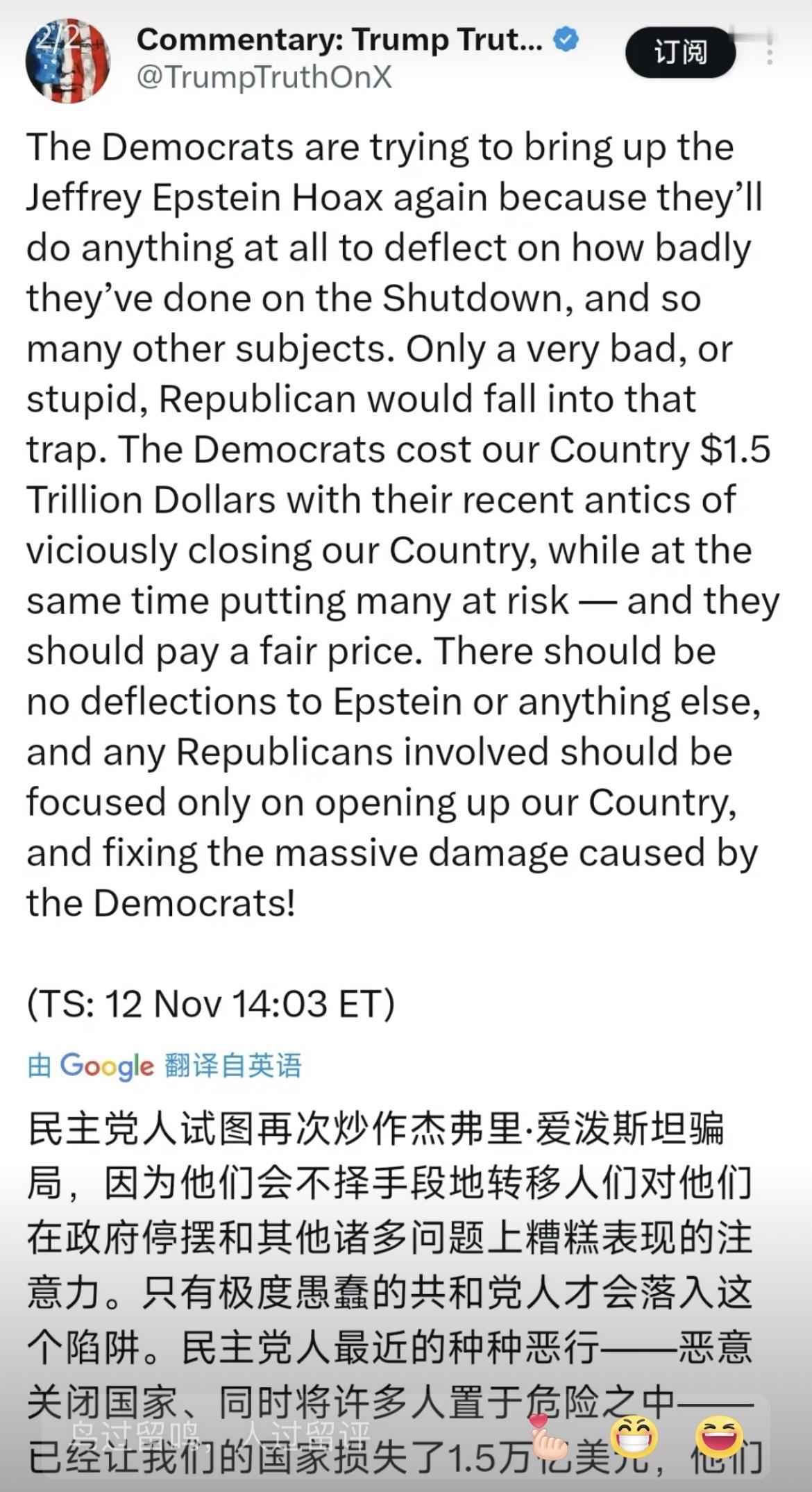 特朗普怒批民主党炒作爱泼斯坦,忘了自己当初的承诺?美国政坛这瓜也太好恰了,特朗普这波愤怒发文 纯属自己打自己脸!明明选举时信誓旦旦说要公布爱泼斯坦案件档案,靠这个吸了不少选票,结果上台后就翻脸不认账,对案件不了了之。现在民主党一提这事,他立马跳脚骂对方转移视线,还说国家停摆损失1.5万亿美元全是民主党的锅。 说白了,这就是典型的政客套路!自己兑现不了承诺,就把议题当工具,有用时拿来炒作,没用时就扣上“骗局”帽子。更有意思的是,他不仅怼民主党,还警告共和党人别上当,本质就是怕内部分裂影响选举。美国政坛的互相甩锅、言行不一,真是展现得明明白白。 你觉得特朗普这番话能稳住他的支持者吗?评论区聊聊~