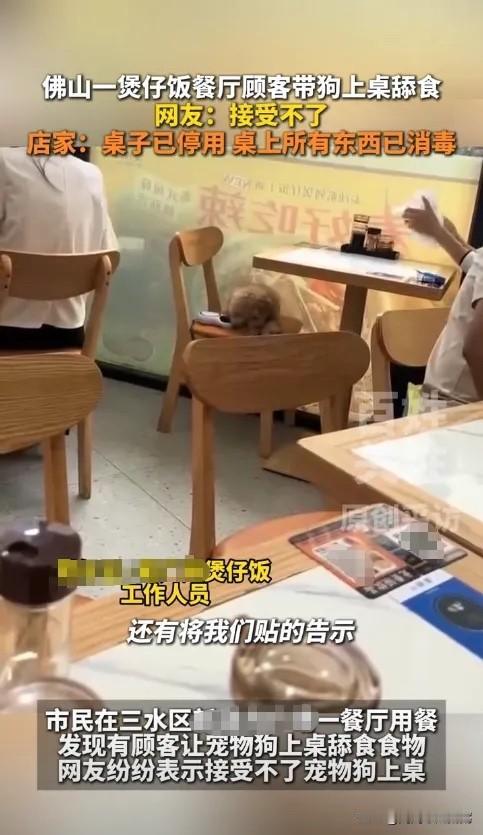 “太缺德了!”11月11日,广东佛山,一女子带狗出来吃饭,餐厅门口有张贴的告示:宠物禁止入内!可女子却偷偷将狗带了进来,随后更是让狗站在餐桌上一起吃饭,服务员看到后立即阻止,并对全店进行了消毒。网友:又一个当儿子养的! 这只宠物狗直接站在餐厅的椅子上,甚至把前爪搭上桌面舔舐。旁边一桌客人看得直皱眉头,赶紧拍下视频发给店家投诉。 店家后来调查发现,这位女顾客是店里的常客。以前来吃饭都会乖乖把狗拴在门口,那天可能是因为天气原因,她悄悄用衣服裹着宠物带了进来。服务员点菜时也没注意到沙发底下还藏着个小家伙。 发现情况后店员立刻上前劝阻,顾客马上把狗抱下了桌。但为时已晚,狗狗舔过的桌面上可能已经留下了唾液。店铺负责人回应称,尽管店内明确禁止宠物入内,但因人手不足导致未能及时发现。 事情发生后,餐厅马上把被狗狗接触过的桌椅全部丢弃,还请专业团队给整个店面做了全面消毒。门口也重新贴了醒目的“禁止宠物入内”标识,生怕再发生类似事情。 狗唾液中的病菌可能通过餐具传播给人,有些对狗毛过敏的顾客还可能引发过敏反应,养宠物本身无可厚非,但在公共场合还得考虑其他人的感受。餐厅毕竟是大家吃饭的地方,需要兼顾不同人群的感受。 各位读者你们怎么看?欢迎在评论区讨论。