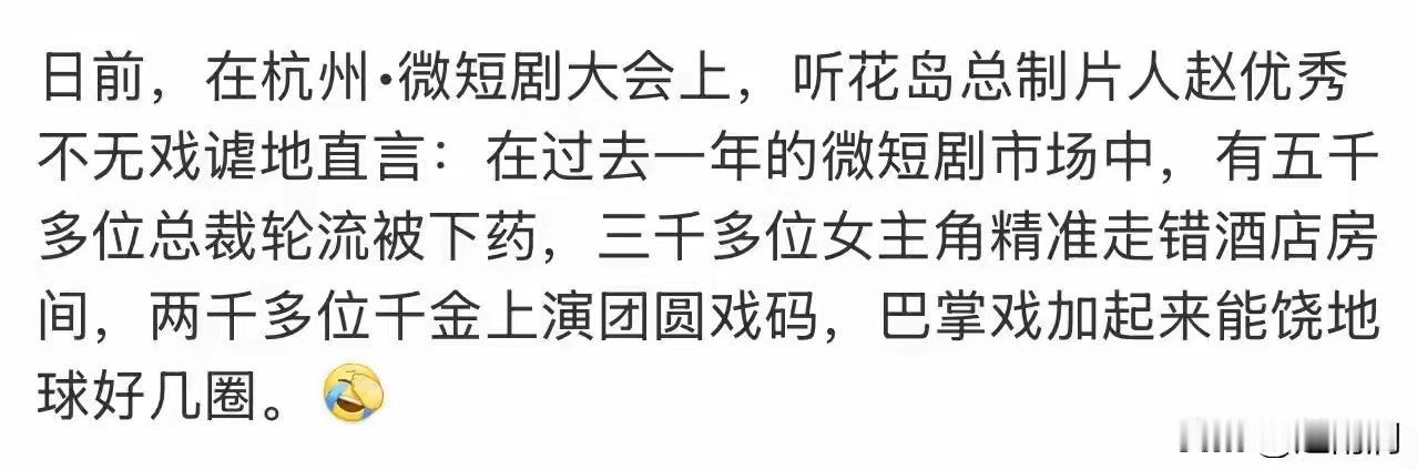 中国的短剧现状:在过去一年的微短剧市场中,有五千多位总裁轮流被下药,三千多位女主角精准走错酒店房间,两千多位千金上演团圆戏码,巴掌戏加起来能饶地球好几圈! 几乎每出必有江城,海城,上京,几乎每出必有周少,秦少,大小姐。动不动几个亿上百亿的项目,一件衣服几千万,几十个保镖随身伺候。 剧情要不就是各种虐,咬啃,打,跪或者各种迷药,男模。这就是短剧,什么打耳光,掐脖子,抓手腕!没有新鲜的,有没有评理的地??现实真这样吗??这样真有流量??不是挨骂吗?????? 真的是毁三观!有100集的话,几乎每个男主角从1-98集都被称作废物,女主角则被称作贱人,在99集大逆转,第100集大圆满