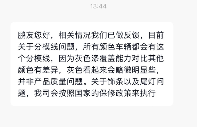 小鹏G6品控堪忧,店大欺客 提车半个月车辆品控堪忧,最严重有2个 1外后视镜油漆瑕疵(见图三) 小鹏回复是正常 工艺导致的合模线,不属于质量问题,不予处理 图四图五是小鹏门店展车并没有这样的瑕疵),且官方明确回复灰色与银色存在合模线,橙色与白色没有,同款车辆因颜色不同出现不同的产品质量,小鹏你就是这么区别对待消费者的 吗? 2、后尾灯多处发现白色裂纹(图一图二),小鹏 官方回复是尾灯双色拼接工艺导致不属于产品质量问题,可以给与更换,但维修期间不提供代步服务(质量问题才有)。小鹏你当消费者是啥傻子?因生产工艺问题导致的产品瑕疵就不属于质量问题了?那么是不是所以只要发现的问题你都可以归咎为工艺问题不是质量问题?那么小鹏的产品质量问题到底是什么呢? 车已交给售后门店,门店回复要将车辆送回,否则不承担保管服务,真的是呵呵了,这就是对广大用户的服务态度,这就是小鹏提供的高品质的轿跑SuV,这就是小鹏的品控,还没提车的各位请考虑清楚