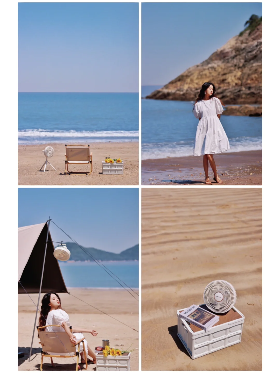 3⃣️可露营,可烧烤,可卡式炉,一定要支好黑胶天幕或者遮阳伞,太阳下热热热~我带了摩飞家的户外风扇,充电的超方便,可以支在沙滩、直接挂在天幕边、摆放桌上~七片扇叶风感柔和,凉风拂面,太舒服了~拍照的时候还可以作为道具!
