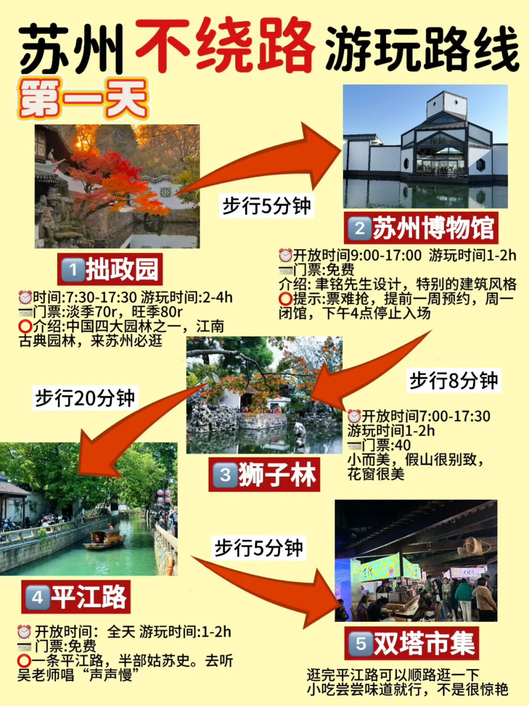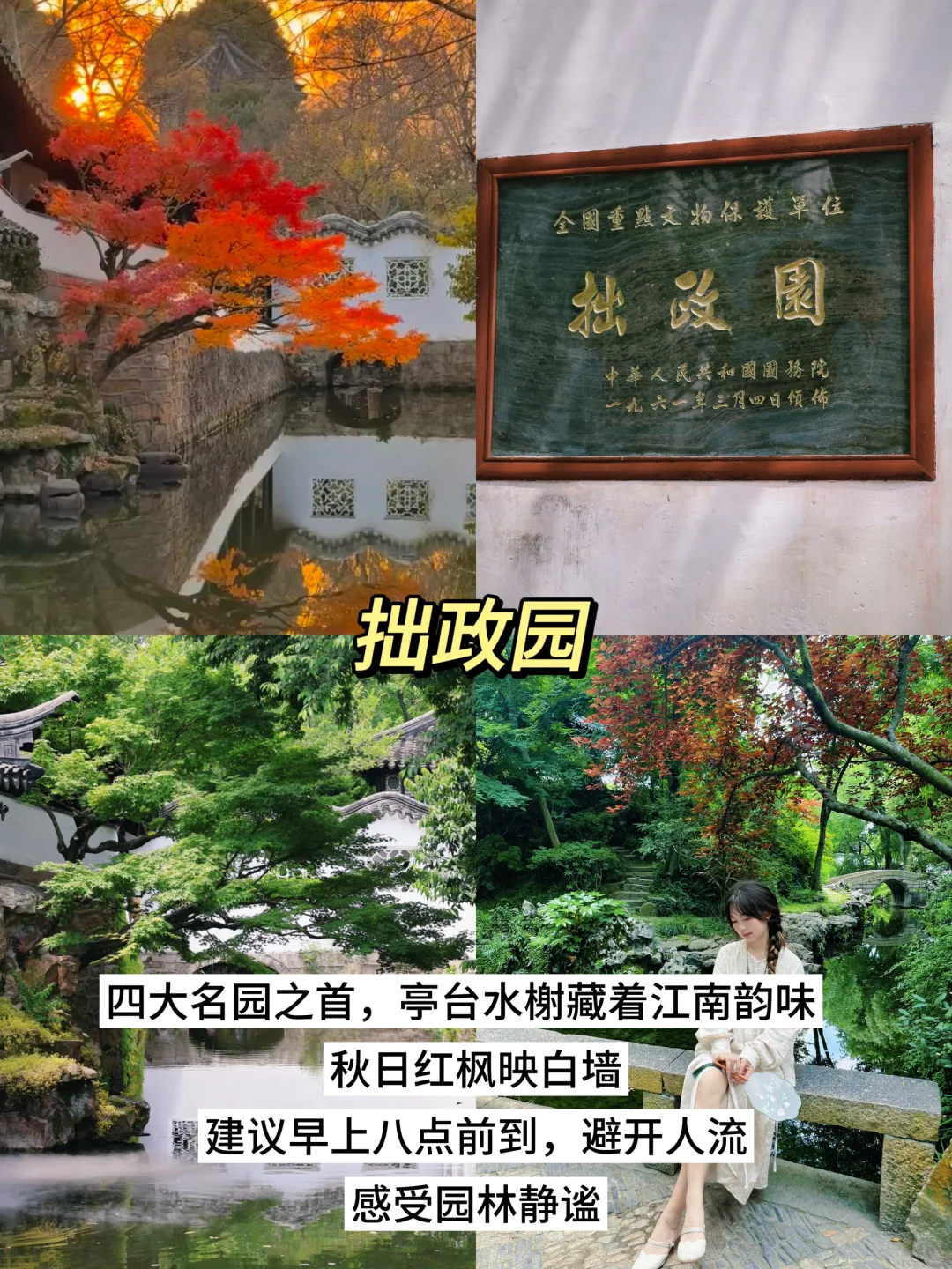 2️⃣拙政园:四大名园之首,亭台水榭藏江南韵味,早9点前入园避人流,秋日红枫映白墙