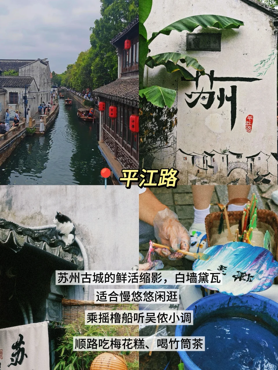 3️⃣平江路:河街相邻古街,慢逛+摇橹船,打卡“苏州”网红墙,顺路吃梅花糕、竹筒茶