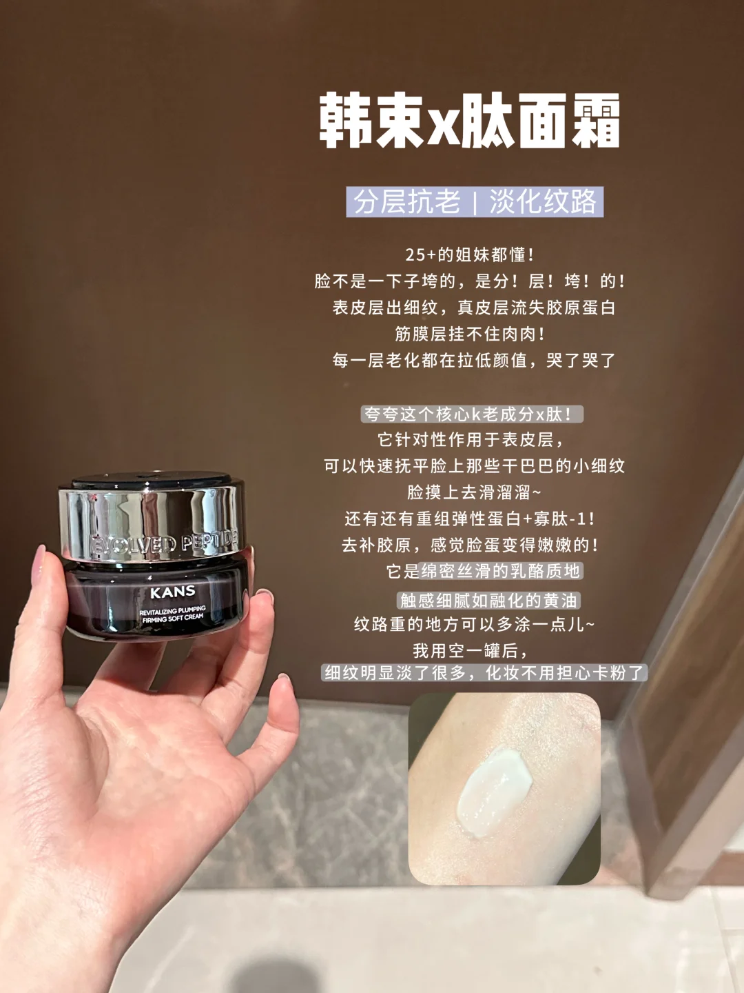 4⃣️韩束x肽面霜:爱笑的、表情纹多的姐妹冲这个,淡纹上有一手,可以在纹路深的地方多涂抹一些再去做做按摩,涌上一阵,会发现化妆卡粉的地方好了很多
