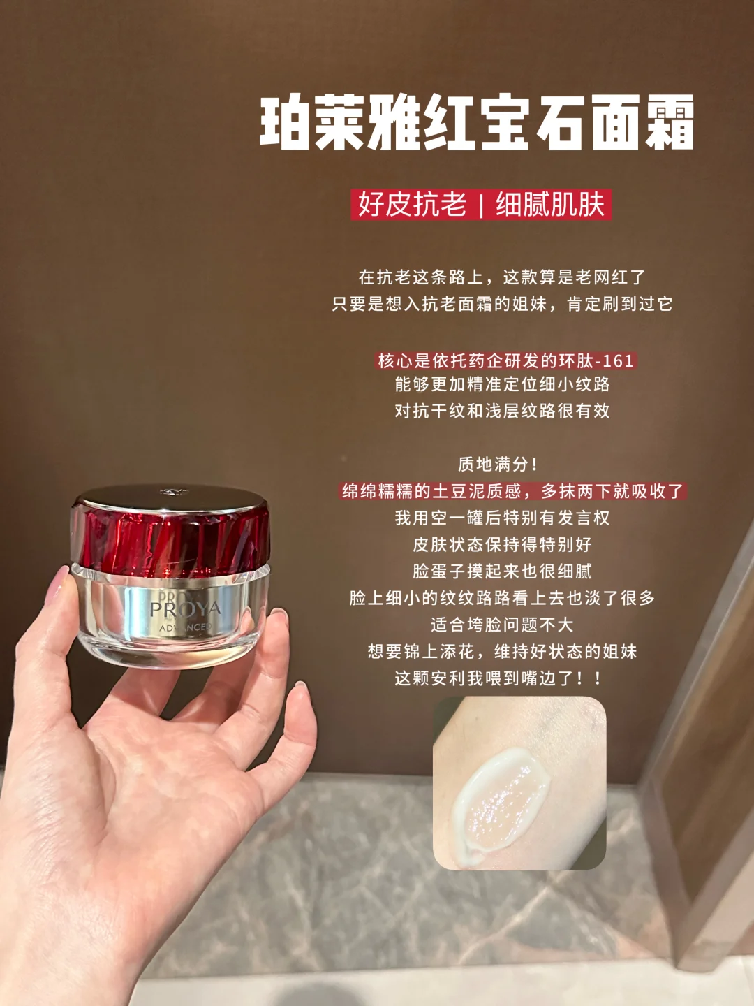 2⃣️珀莱雅红宝石面霜:适合脸上没什么大问题,想要更上一层楼的好皮姐妹,用它!在帮你维稳的基础上,把脸上浅浅的细小纹路摁下去,肌肤摸上去也会更加细腻好rua