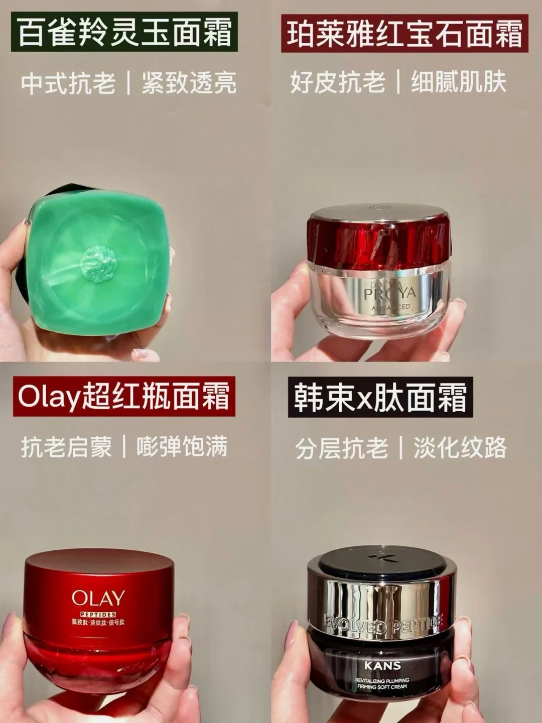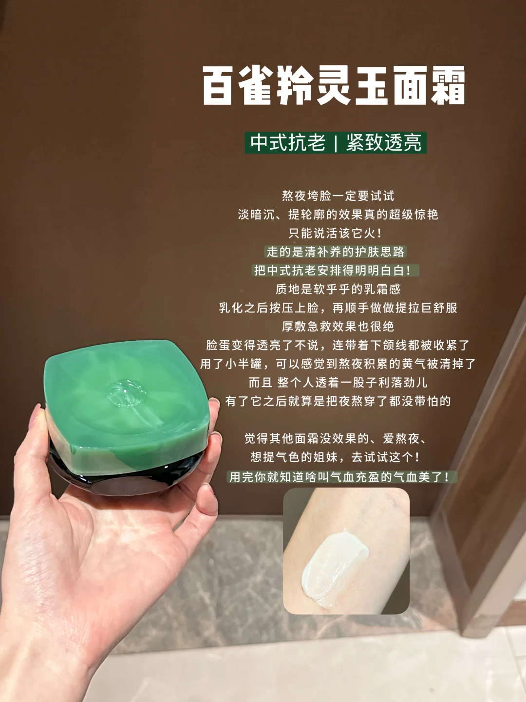 1⃣️百雀羚灵玉面霜:熬夜垮脸党用过之后就离不开了,紧致提亮效果一绝。厚敷急救效果巨明显,脸蛋变得透亮了不说,连带着下颌线都被收紧了,整个人透着一股子利落劲儿