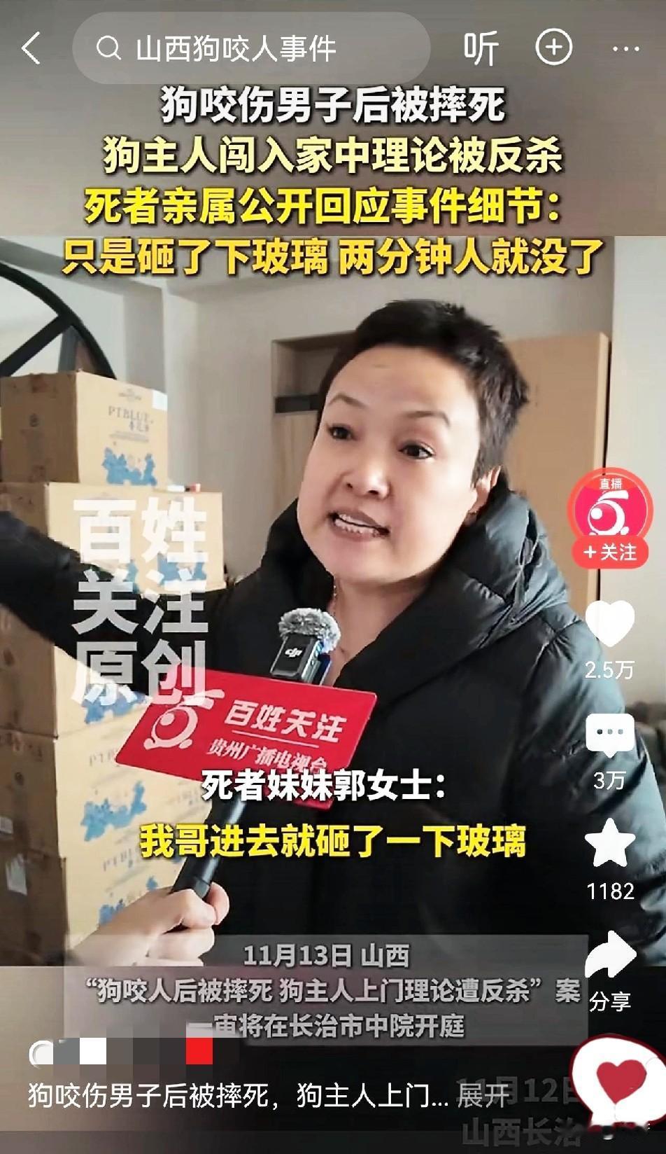 这女的说谎了 狗把人咬伤后被摔死 狗主人叫人找到摔狗家里破门入室打砸一共有9人参与了打砸扬言摔狗的人要赔狗命 9人持械闯私宅打砸还放狠话 这根本不是“理论”是赤裸裸的不法侵害 被闯者反杀看似极端实则是绝境自保 伤口在大腿动脉而非要害 恰恰证明他没杀人之心 只是想阻止伤害 狗主人先没管好狗 又聚众暴力上门寻仇 过错在前:被闯者护家反击 符合“法不能向不法让步”的常识 把自保者当成被告 这冤屈换谁都难接受