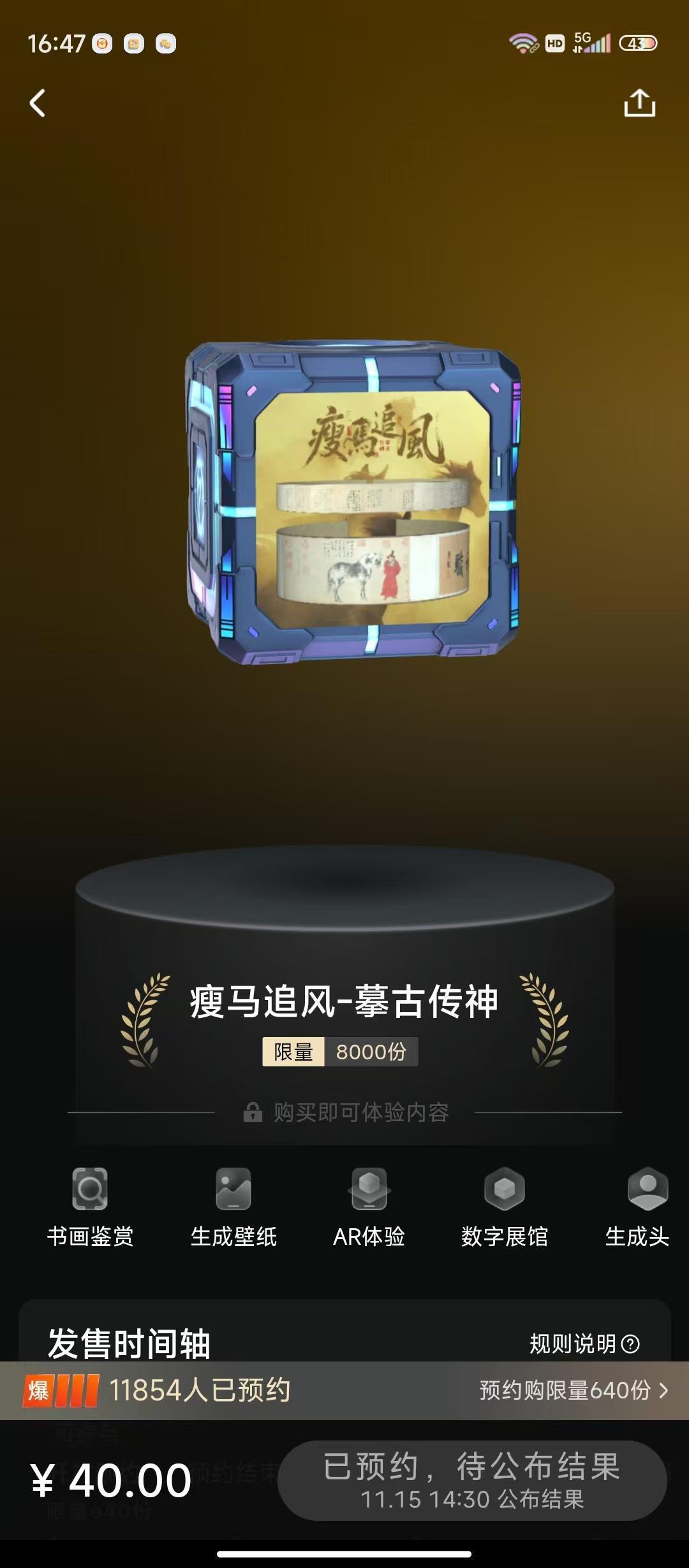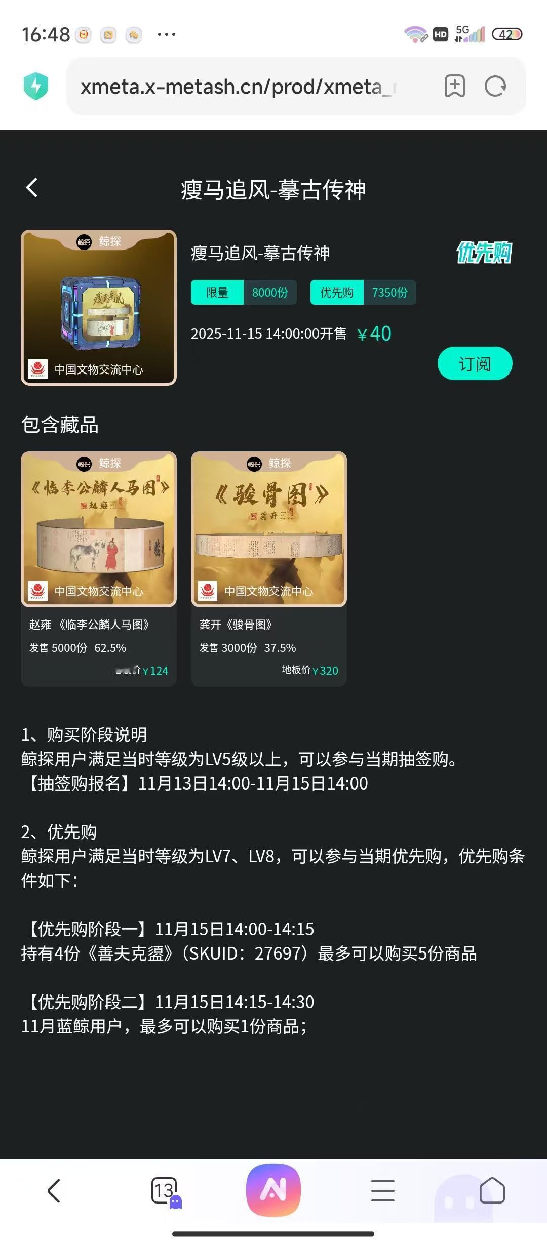 鲸探书画文物今日抽签开始,看看你是否是那个幸运儿。 在今日,由中国文物交流中心发行的瘦风追马-摹古传神盲盒开始抽签,参与条件为5级以上,其中包含龚开的《骏骨图》3000份,赵雍《临李公麟人马图》5000份,发行价为40元,其中二级市场的价格分别为320,120,最高溢价达到了7倍以上。这么高的收益率来源于用户对于发行方的信任以及对文物价值的认可,文化的烙印深深刻在每一个中国收藏家的心中。 龚开《骏骨图》为龚开传世代表作中极为珍贵的一件,具有极高的艺术与历史价值,是研究宋元之际文化变迁与文人思想的重要实物资料,在中国绘画历史上有着不可或缺的显著地位。《骏骨图》以极简笔墨勾勒出一匹瘦马的嶙峋姿态,老马低首漫步风中,腰间15条肋骨历历可数,却仍保持着昂首屹立的傲骨。背景仅以淡墨晕染出苍茫天地,更显马之孤绝。此作线条融合篆隶笔意,瘦硬如铁,开创“简笔鞍马”之绘 画范式。龚开以遗民身份托物言志,寄故国哀思与士人节气,深刻影响后世文人画的抒情传统,成为研究宋元易代之际士人心境的重要视觉文献。 乾隆皇帝对这幅画非常欣赏,留下了题签、题诗和大量鉴藏印,其侧亦留存杨维桢、倪瓒等宋元名士的题跋墨迹,共同奠定了此画作为遗民风骨象征的崇高地位。 赵雍《临李公麟人马图》是赵雍的代表作之一,也是研究宋代绘画传承、白描技法演变及跨时代审美交融的重要范本。 赵雍《临李公麟人马图》为临仿北宋李公麟白描《五马图》中的第一组人马像,并敷以颜色。在保留李公麟原作构图基础上,突破李公麟白描传统,运用石青、朱砂等矿物颜料对人物服饰进行渲染。牵马者身穿朱衣,两臂袍于腹前,侧脸望着身后的贡马,漫步前行。画人马采用游丝描与铁线描结合的笔法,用线细劲连绵,人物面部须发精细勾勒,马尾线条疏密有致, 极为精彩。