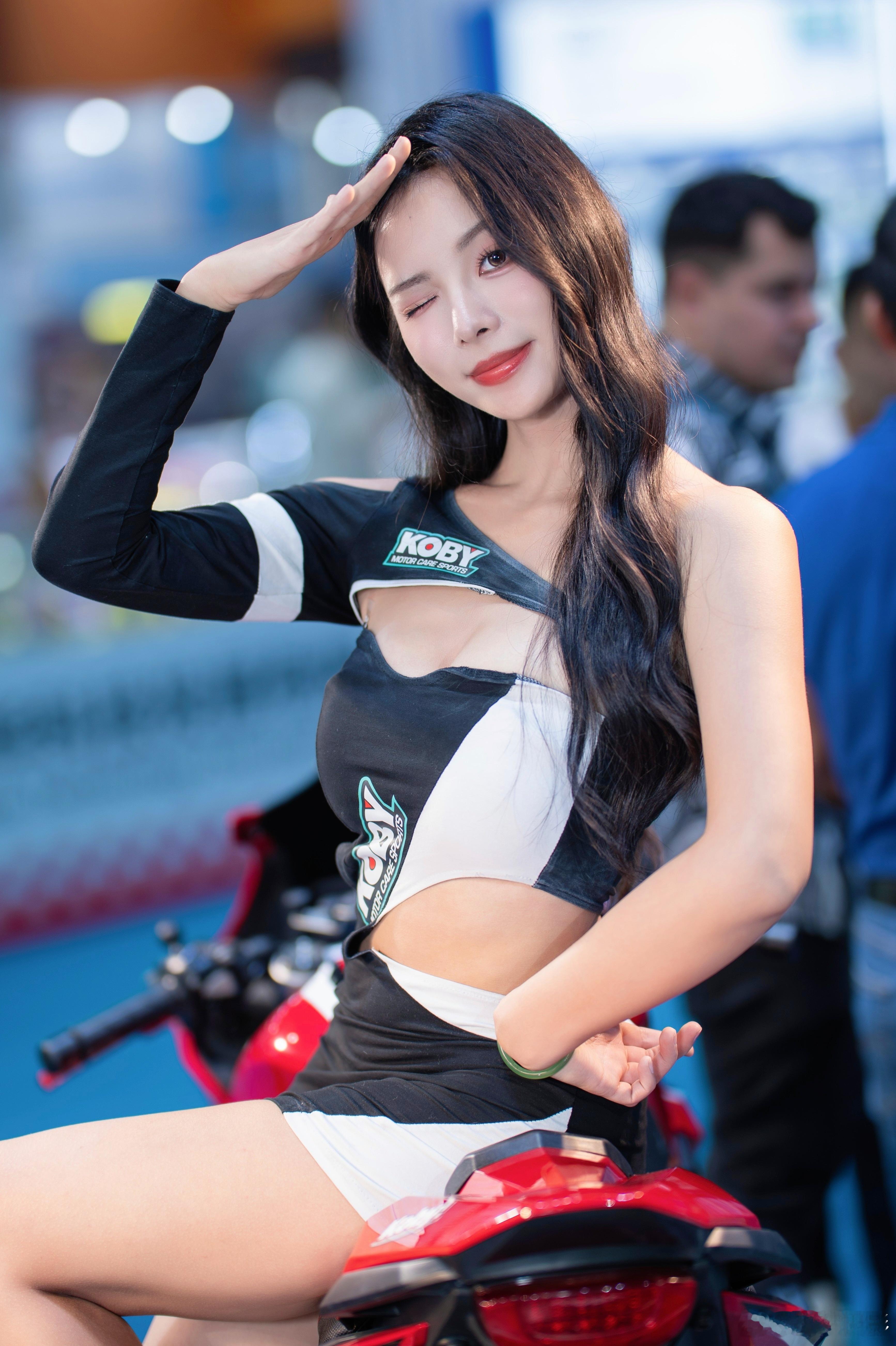对面的女孩看过来,坐在摩托车上的小姐姐模特:未闻芳名活动:广州摩配展