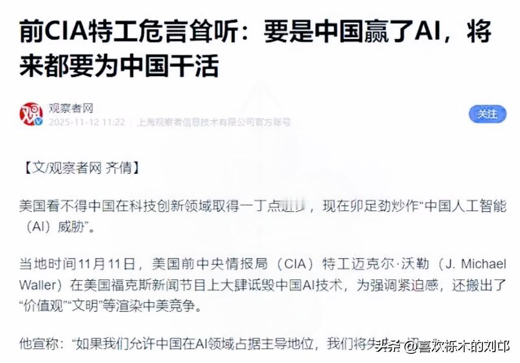 前中情局特务公开放话: 美国要是在AI领域输了中国 将来得给中国人打工? 这两天福克斯新闻的采访直接炸了锅,前中情局人员沃勒的这番话,听着夸张到离谱,实则戳破了美国霸权的最大心病。 所谓“给中国打工”根本不是怕就业被抢,而是美国攥了几十年的科技霸权,第一次感受到了摇摇欲坠的恐慌。他们早就习惯了在芯片、互联网这些关键领域当“规则制定者”,现在突然发现,中国AI居然从跟跑追到了家门口。 中国AI的厉害,从来不是某一个模型的单点爆发。科大讯飞刚发布的星火X1.5大模型,性能快追上GPT-5,还能搞定130多个语种,关键是全程用的国产算力,彻底绕开了美国的技术卡脖子。更狠的是,我们的专利申请量连续8年全球第一,论文影响力甩下美国一大截,产业规模都冲9000亿了。 这根本不是简单的技术竞争,而是发展逻辑的对决。美国总想着用垄断和封锁保住霸权,中国却走出了“研发-应用-迭代”的闭环——AI既能帮医生看病,又能给老人护安全,还能赋能汽车、教育这些行业。这种扎根现实的技术生命力,才是最让美国慌的。 其实美国的焦虑早该料到,霸权思维下的“只能领先”本身就是畸形的。世界从来不是谁的独角戏,技术进步的意义也不是用来垄断的。 你觉得中国AI能真正实现全面领跑吗?核心优势到底是技术、生态还是别的?评论区聊聊你的看法~