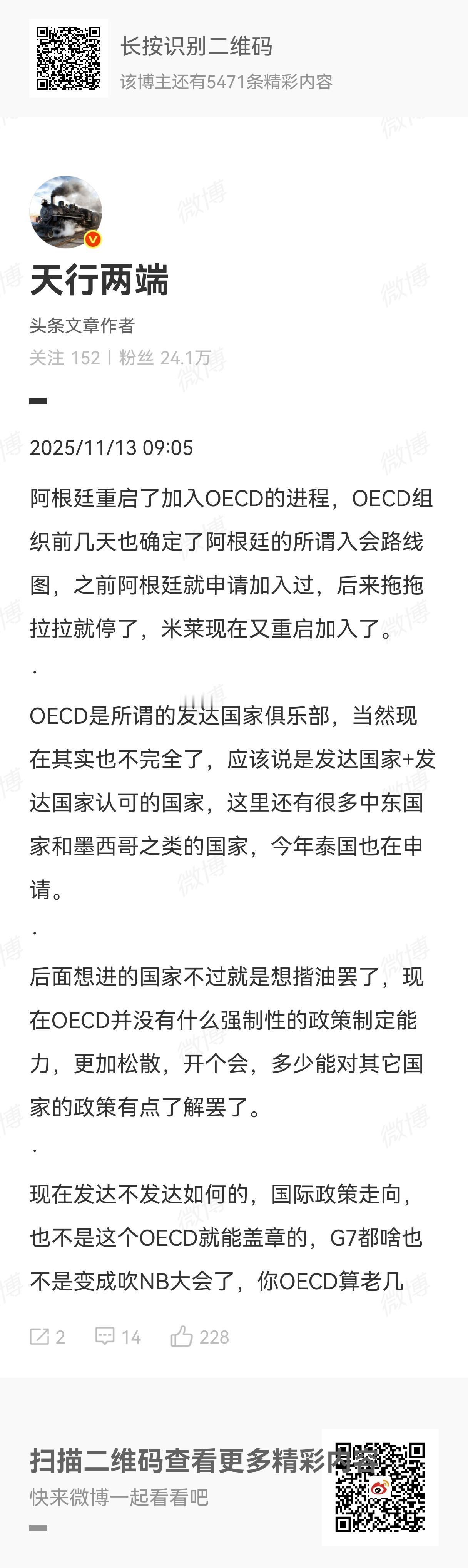 自米莱2023年11月当选阿根廷总统以来,2023年12月阿根廷重启了加入OECD的进程。所谓OECD,书面名称叫做“经济合作与发展组织”,也就是但说的“富国俱乐部”。1961年正式成立,总部在法国巴黎,前身为欧洲战后重建的欧洲经济联合体。现有38个成员国,比如G7、墨西哥、土耳其等,现任秘书长是马蒂亚斯·科曼,英语和法语为官方工作语言。目前除了阿根廷,还有巴西、印度尼西亚都在积极推动,想加入其中,争当“富国”。当然没有中国和印度这样的“穷亲戚”,也没有俄罗斯这样受极度制裁的国家。