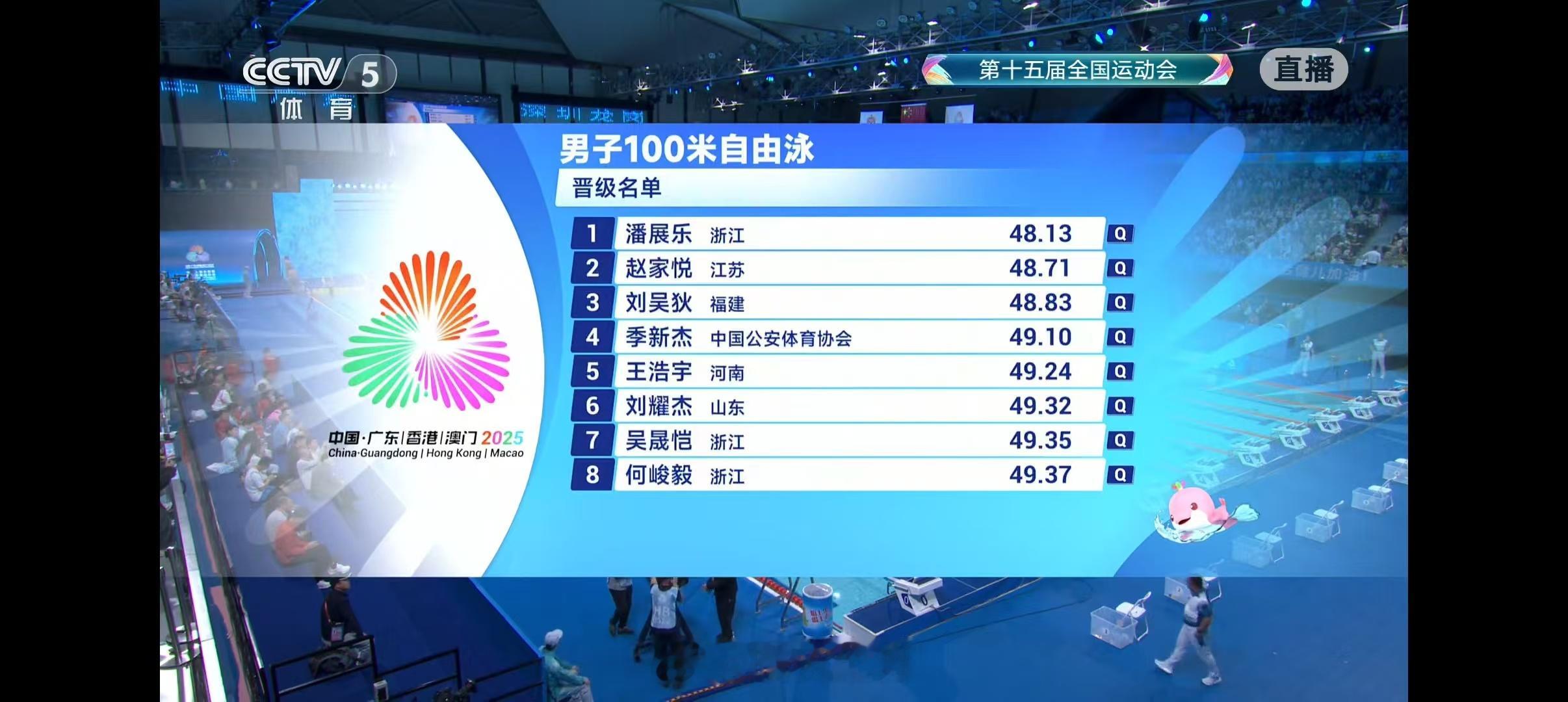 男子100米自由泳半决赛1.潘展乐 48.132.赵家悦 48.713.刘吴狄 48.834.季新杰 49.105.王浩宇 49.246.刘耀杰 49.327.吴晟恺 49.35 8.何峻毅 49.37 半决赛前8名晋级决赛