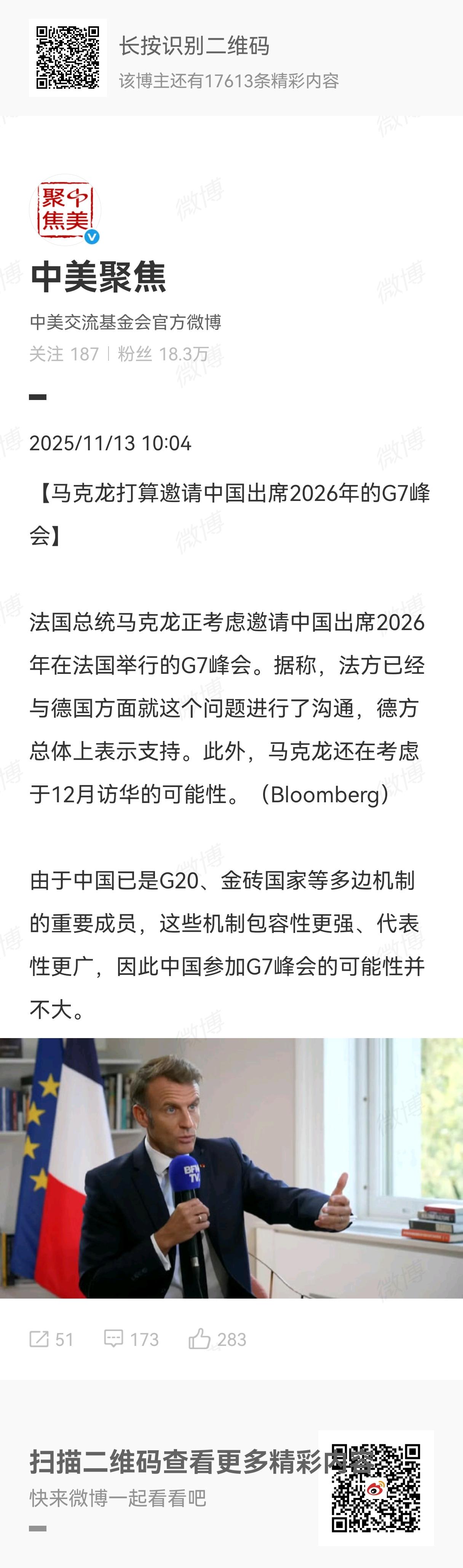 明年的G7峰会东道主是法国,所以马克龙对外透露,将邀请中国出席2026年在法国依云举行的G7峰会。德国目前已经明确表达自己的立场,同意中国参加。加拿大、意大利和英国大概率也是同意的;美国嘛,按照特朗普的调性也同意;很多人猜测日本不会同意,我猜日本会同意。不要看“搞事早苗”现在跳的欢,过不了多久日本国内会跟她拉清单,所以到时候日本会同意的。但这只是G7自己一厢情愿的想法,去不去主要看我们自己。实际上现在有点儿“神女有心,襄王无意”的意味儿。