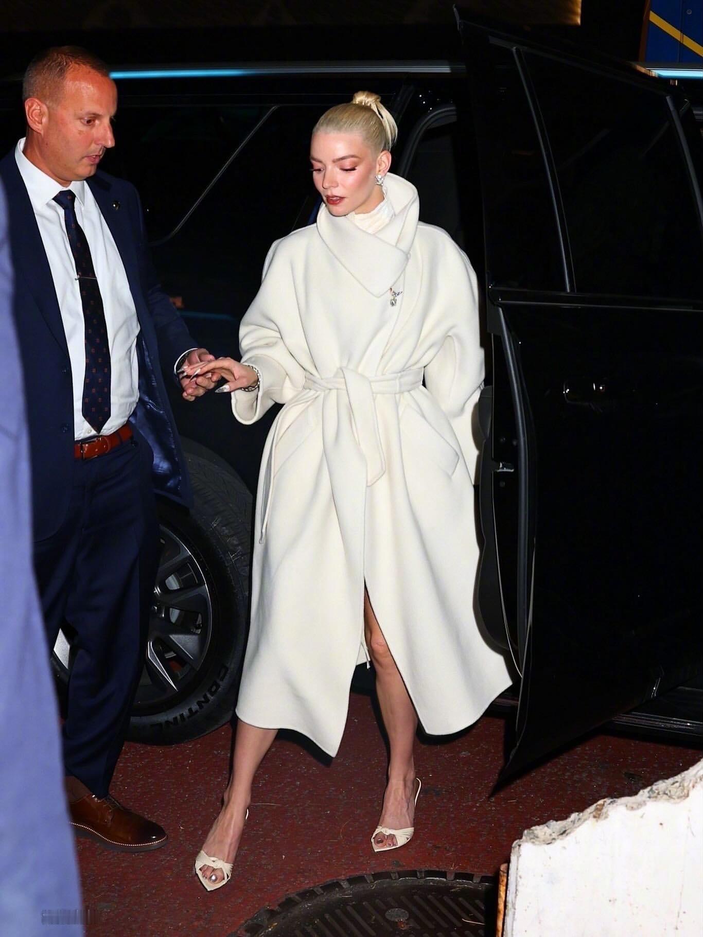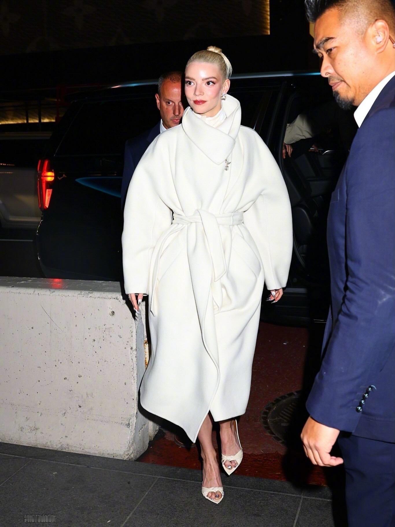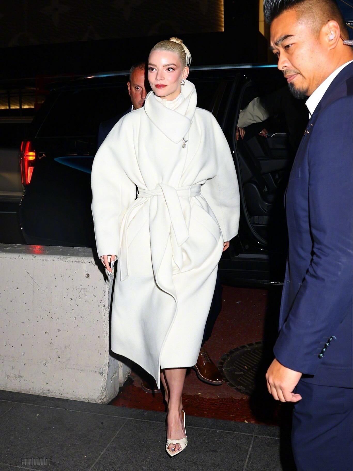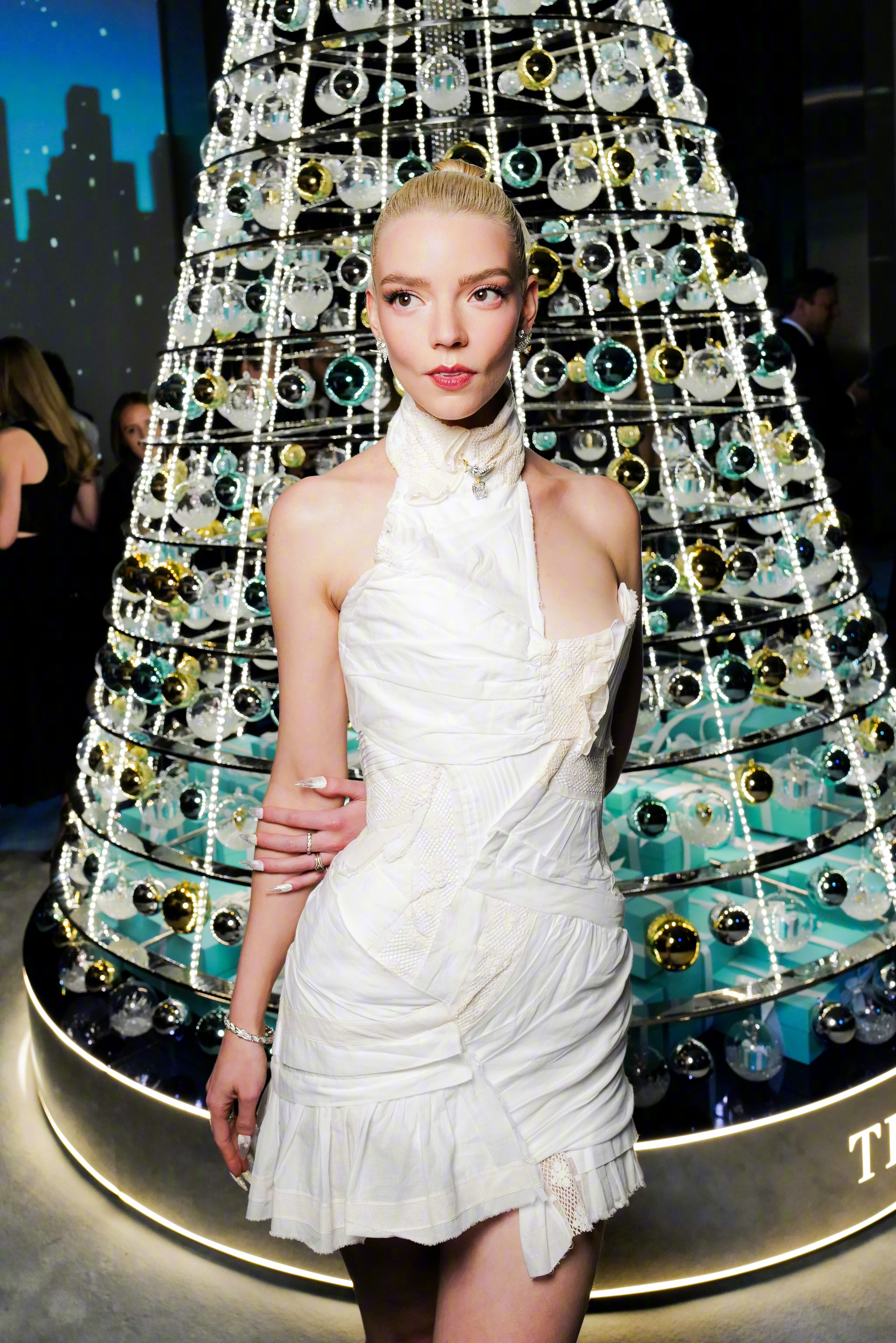安雅Anya Taylor-Joy衔恨纽约出席尼 Tiffany & Co. 假日活动。身穿Dilara Findikoglu 2026 春夏连衣裙,脚穿Giuseppe Zanotti 结饰凉鞋,佩戴Tiffany & Co. 岩石上的鸟系列耳环和胸针。廓形白色大衣真漂亮。