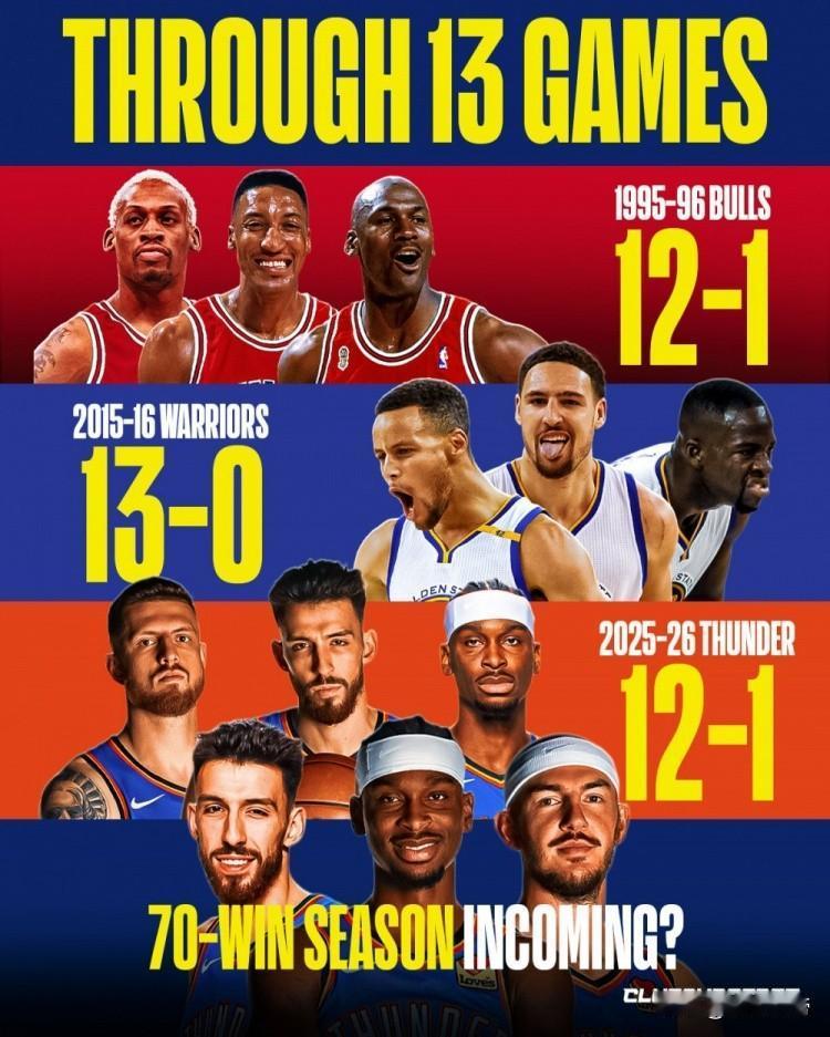 超公牛追勇士,雷霆本赛季能否成为史上最强球队? 本赛季卫冕冠军雷霆开局表现相当强势,13场比赛取得了12胜1负的战绩,已经追平了96年公牛72胜的同期纪录,仅次于16年73胜勇士的记录。 更恐怖的是,雷霆这还是在缺少二当家杰伦·威廉姆斯的情况下取得的,要是等杰伦-威廉姆斯复出了,还有哪支球队能的挡得住雷霆呢?东部一盘散沙一个能打的都没有,西部也就只有掘金和火箭了,但是约基奇和杜兰特都没有亚历山大稳定。 本赛季的雷霆有望超越72胜的公牛,追平甚至超越73胜的勇士,成为史上最强的常规赛球队。