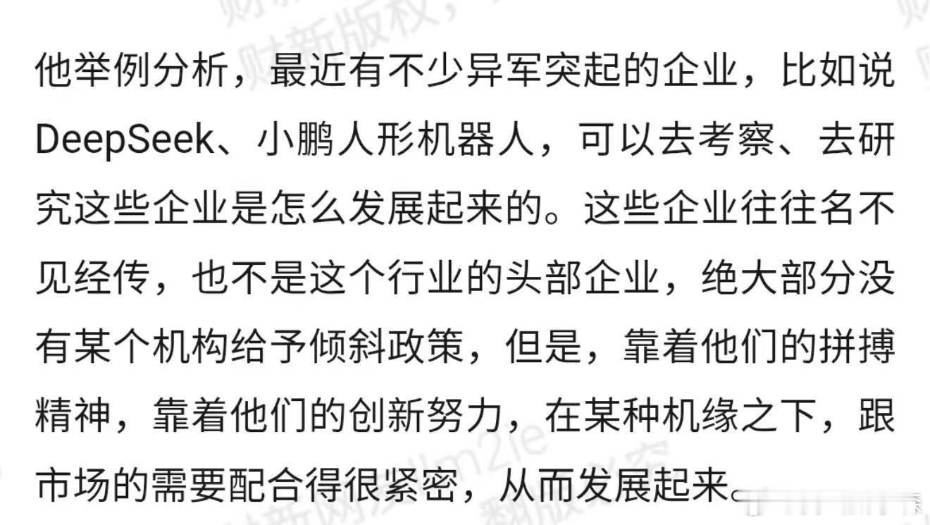 在第十六届财新峰会的视频致辞中,国务院发展研究中心高级研究员、财新传媒公信力委员会主席吴敬琏表示:“最近有不少异军突起的企业,比如 DeepSeek、小鹏人形机器人,可以去考察、去研究这些企业是怎么发展起来的。靠着他们的拼搏精神、创新努力,与市场需求紧密结合,从而发展起来。”小鹏汽车董事长兼 CEO 何小鹏随后回应:“很开心,特别感谢吴老先生的鼓励,小鹏机器人会加速奔跑。”