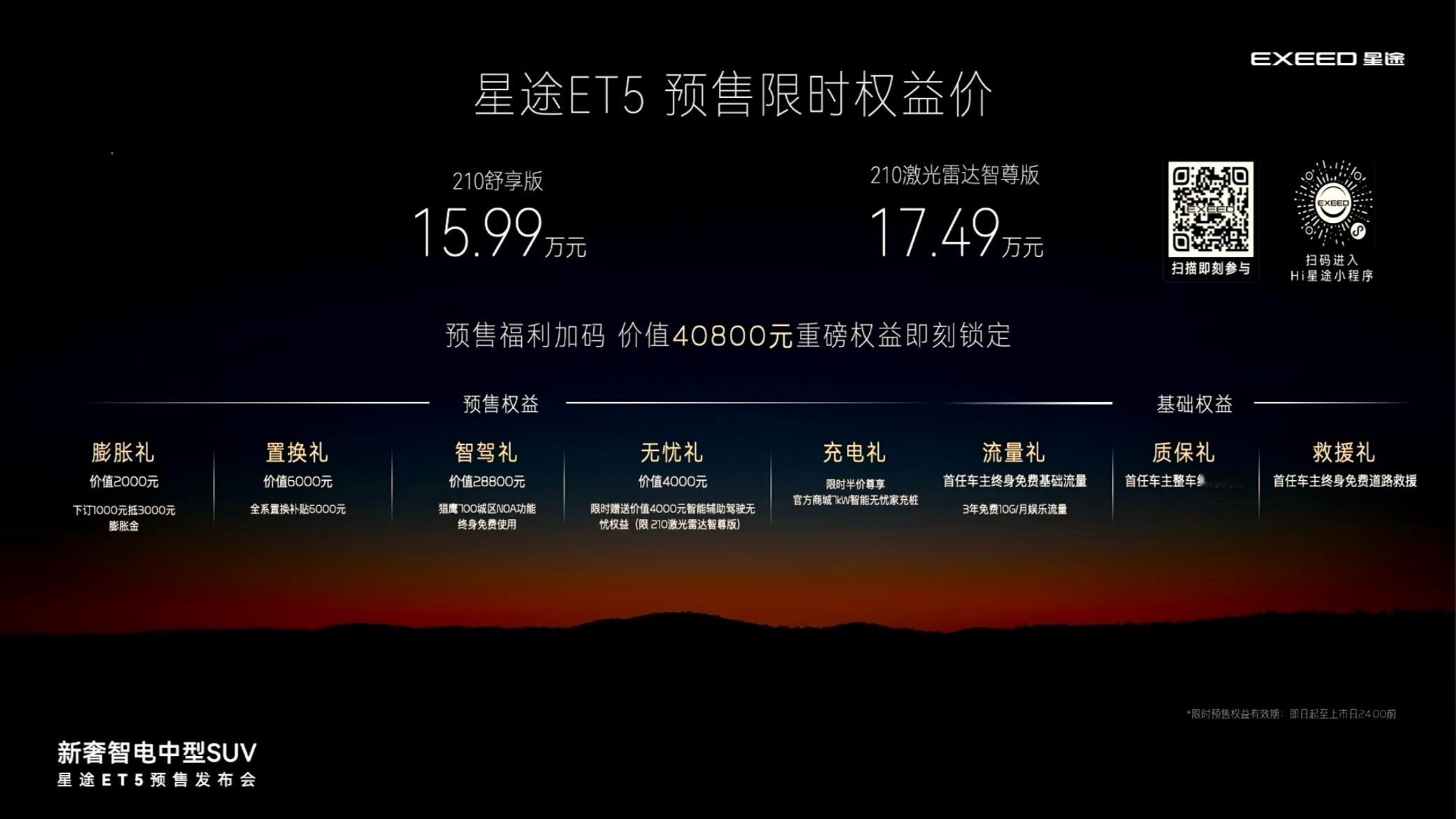 15.99-17.49万的星途ET5还是有点贵了基础参数:4780*1890*1725mm,轴距:2800mm(中型SUV)驱动形式:增程后驱增程器:1.5T电机功率:195kWcltc续航:205km电池容量:32.66kWh(国轩高科电池)零百加速:7.6s悬架:前麦弗逊后H臂多连杆轮毂:20寸轮毂+马牌静音轮胎屏幕:10.25仪表+15.6中控屏+12.3副驾娱乐屏车机芯片:高通8255智驾系统:猎鹰700驾驶辅助智驾芯片:地平线征程6P智驾硬件:1激光雷达/3毫米波雷达/11摄像头/12超声波外观颜色:灰/白/黑/蓝/紫内饰颜色:米/橙其他配置:软包80%、50w无线充、全景可开启天窗+遮阳帘、女王副驾、540影像、256色氛围灯、标配7气囊15.99万 210舒享版猎鹰200智驾/高速NOA主副驾电调/皮方向盘/8扬声器/50w快充/行车记录仪前挡隔音玻璃/电折叠后视镜/19寸轮毂/哨兵模式17.49万 210激光雷达智尊版猎鹰700智驾/激光雷达/城市NOA/8255芯片主副驾电调+腰托+腿托/加热通风/21扬声器/方向盘加热/前排双层隔音玻璃+后排私隐玻璃/膝部气囊虽然也是达到了中型suv的标准,配置也很给力,高配给了新的芯片和激光雷达+猎鹰700智驾,可是这定位还是略高了一点,教授原本猜的价格是15.99能做到顶配,结果最高配还是高出了两万块,面对目前这么激烈的市场竞争,显然这价格还是有商量的空间的。就希望上市发布会能给点力,给一个好一点的价格吧。