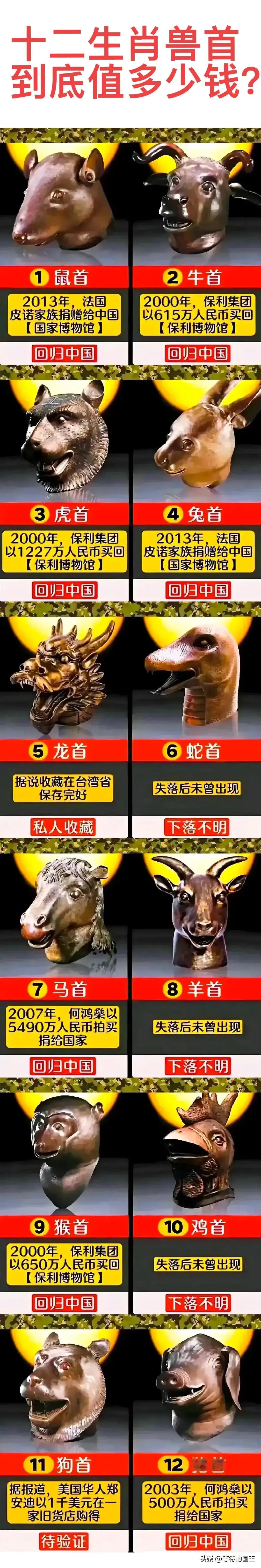 12生肖:有些永远找不到了。 说实话,12生肖只是水龙头而已,是圆明园的水龙头。 非常不值钱。 但是,十二生肖却代表了我们不堪的过去。 所以我们对于外国人拍卖兽首这件事非常抵触。 甚至是以外交手段去抵触。 原因就是他们在揭开我们即将愈合的伤疤,非常无耻。