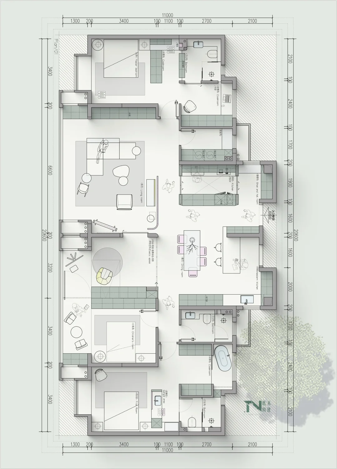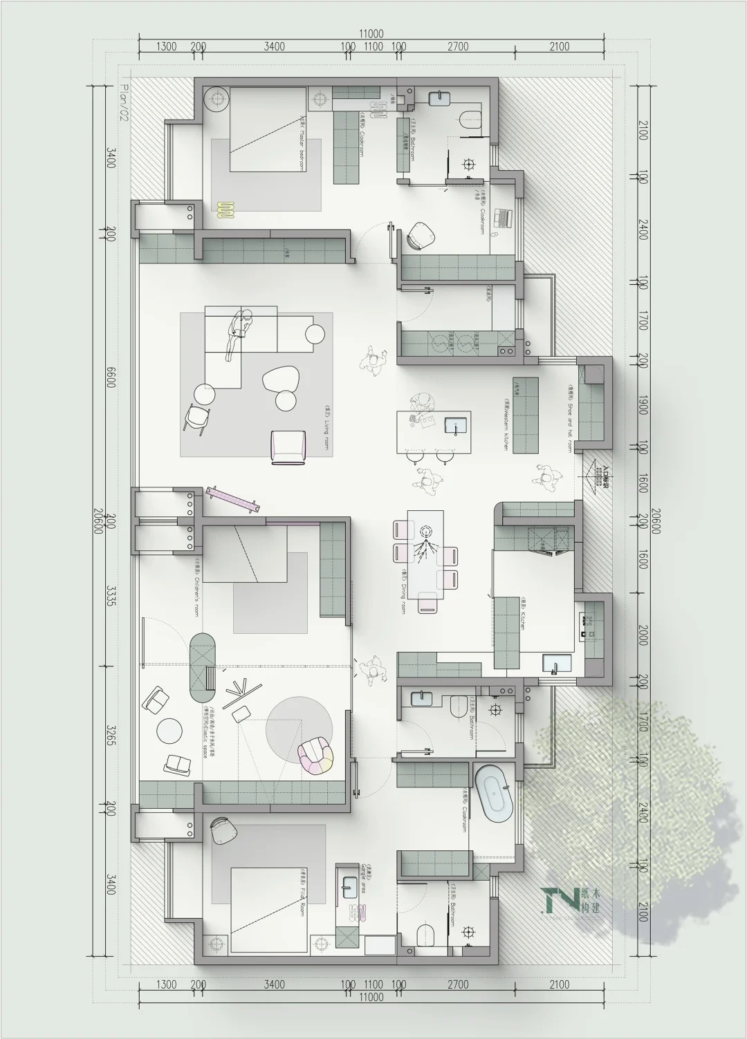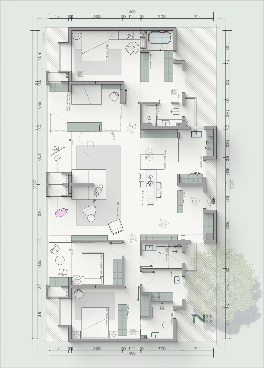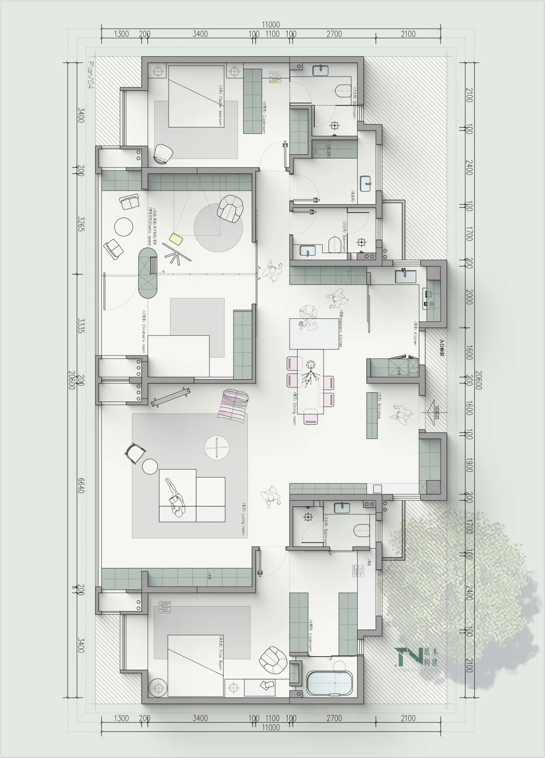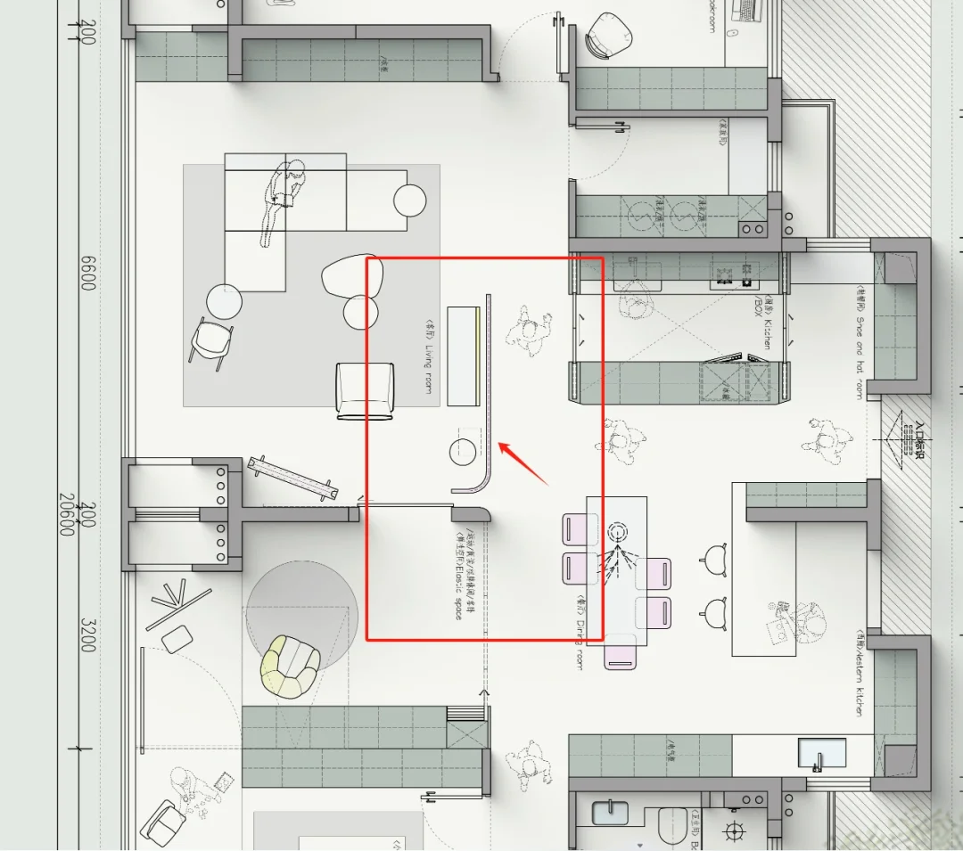 设计需求 两套打通 五口之家 1、保留4个卧室,两边次卧扩大 2、中西厨 3、公共区留一面墙挂衣服(尽量多的空间) 4、小朋友画室、阅读区 5、洗衣房,空间通透显大 6、两边主卧要衣帽间,主卧这边要书桌(可以放在衣帽间)主卫不要浴缸,父母主卧要阅读区,主卫要浴缸 7、只要一个入户门