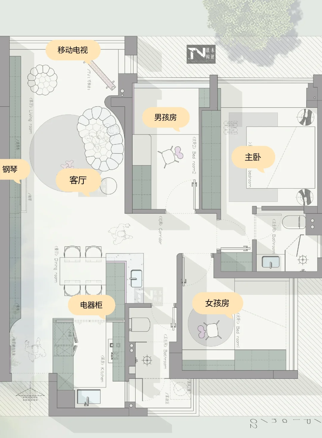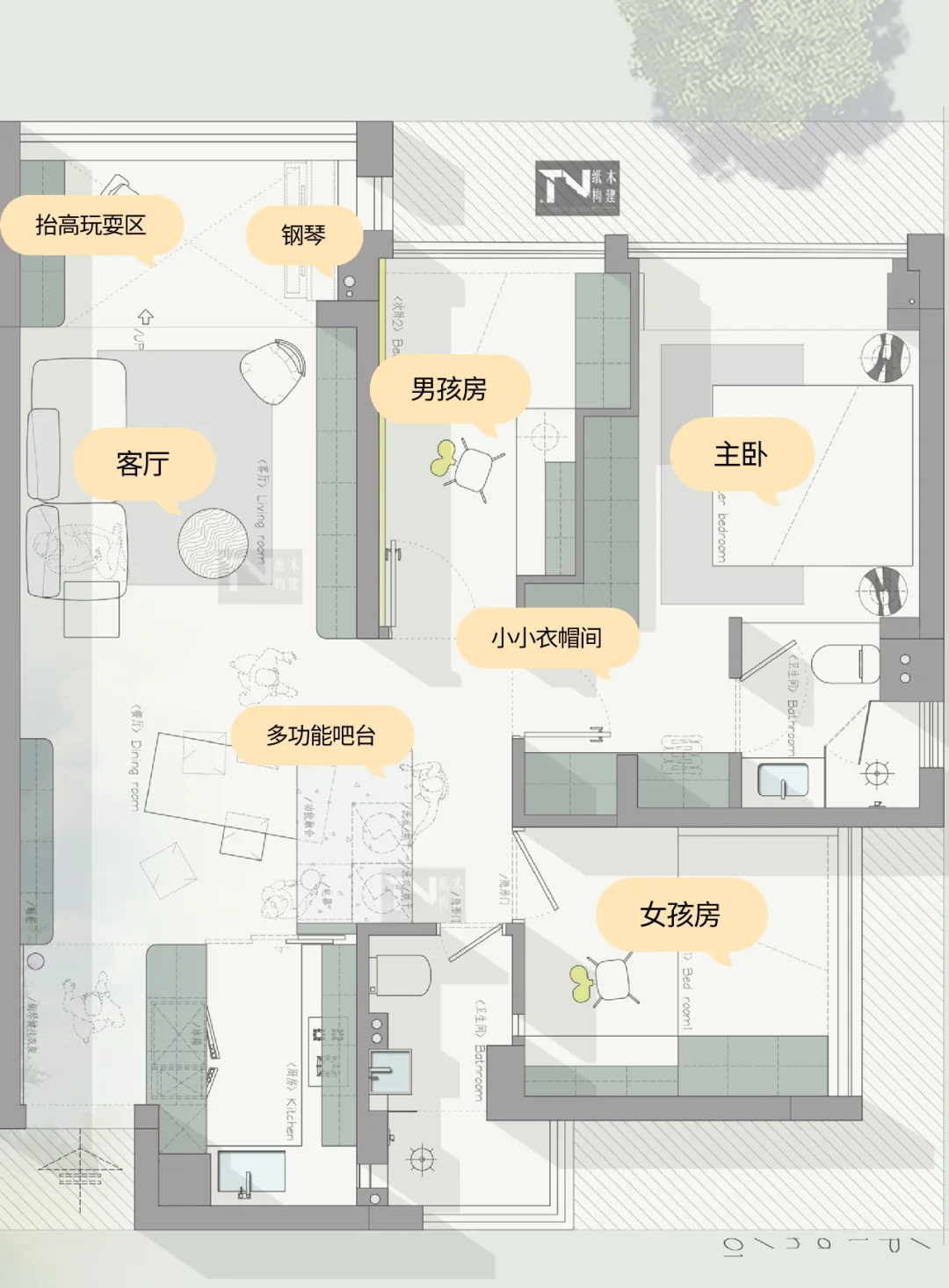 设计需求: 1、一家四口 2、男孩女孩都要有自己独立的卧室,要做书桌 3、主卧想要衣帽间不行也要一个大衣柜 4、想要一个吧台,尽量做吧 5、有个钢琴