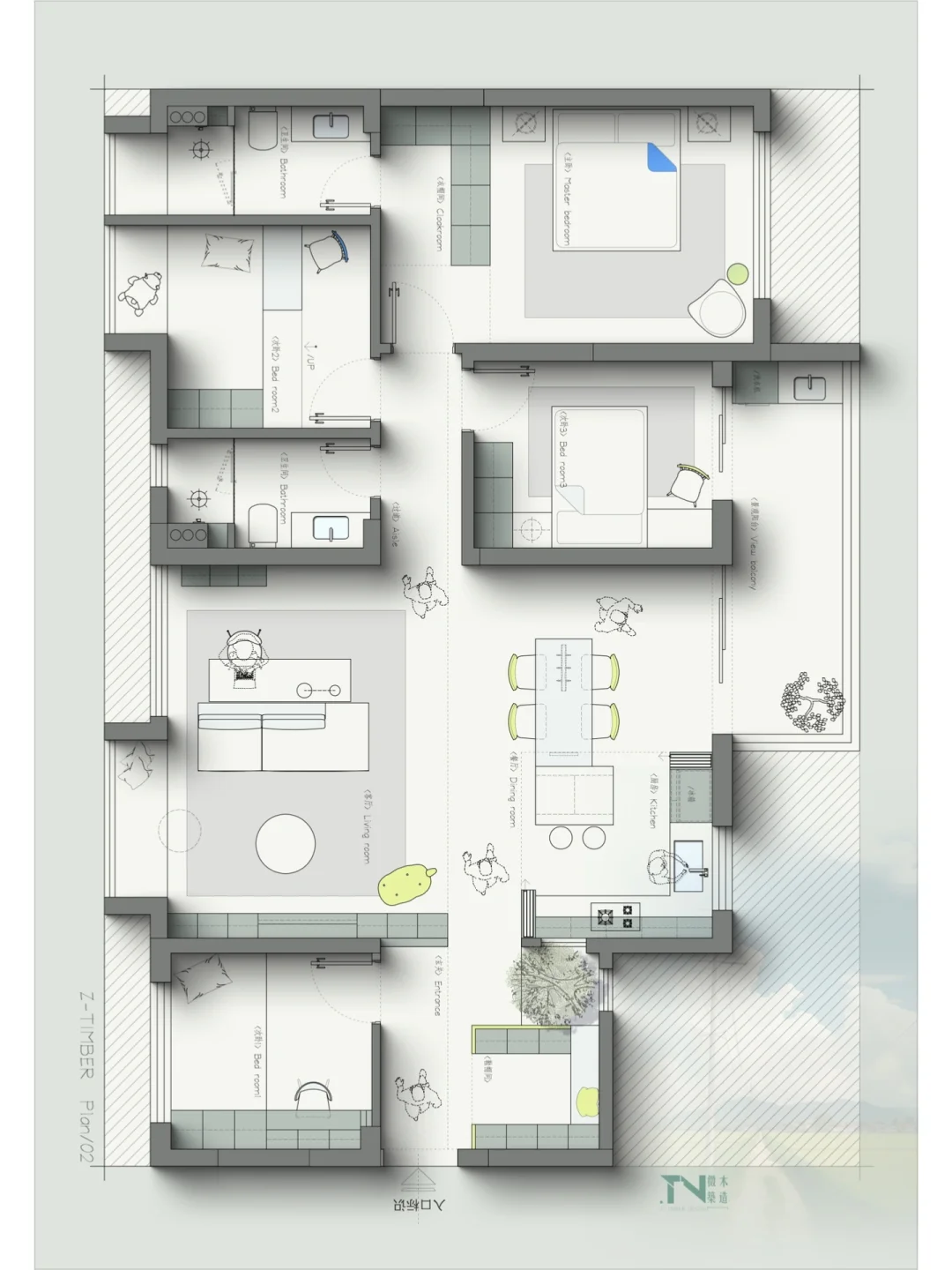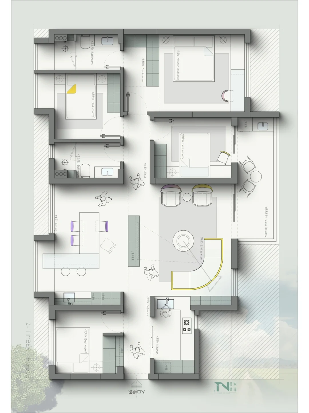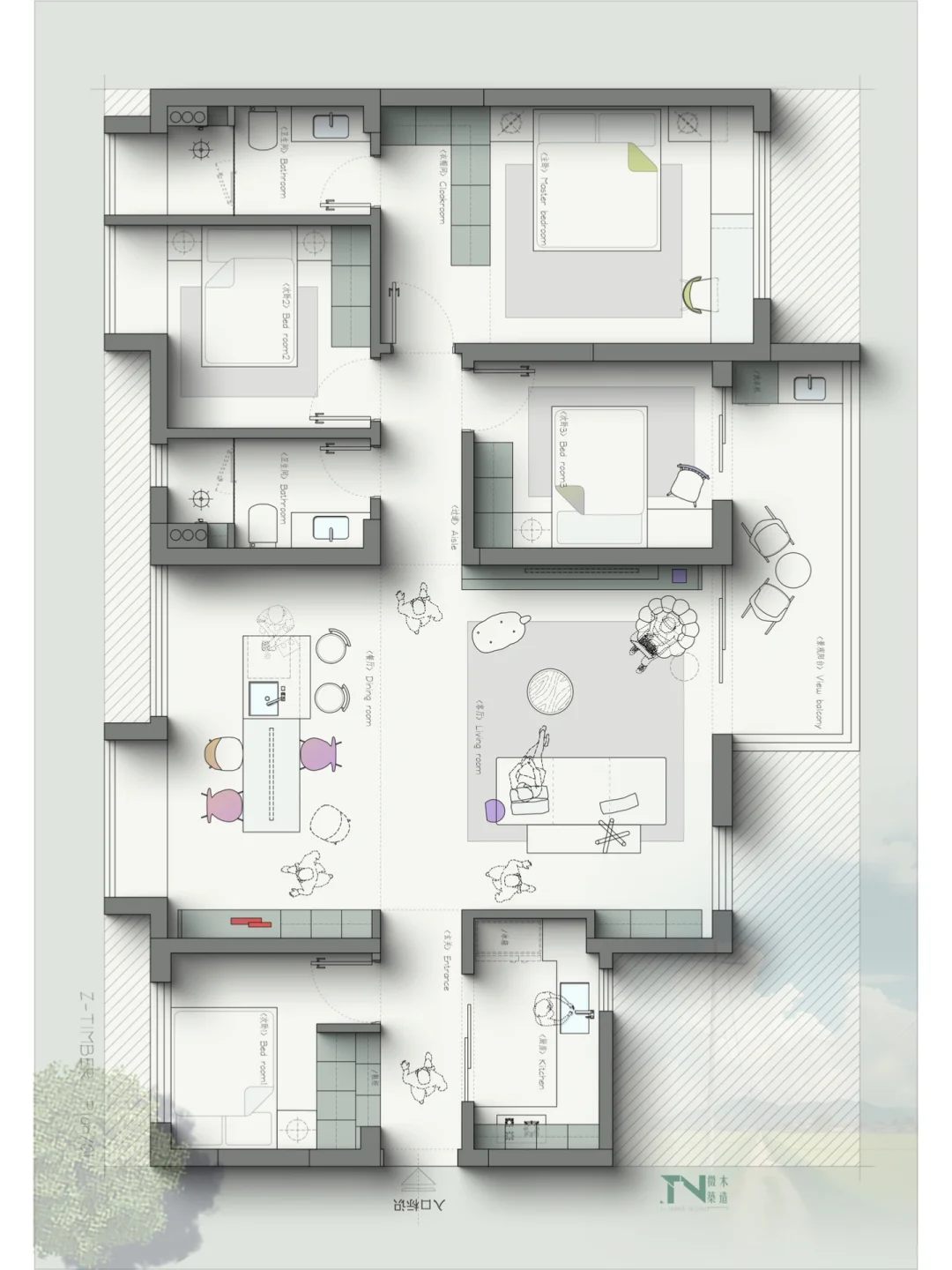 设计需求: 1、一家四口(两个小朋友) 2、需要保留四房,一个主卧套间、两个孩子房、一个客房(有时爷爷奶奶会过来小住) 3、主卧想要衣帽间 4、不介意穿堂风 5、先要玄关 6、需要一个办公地方 7、周末喜欢跟孩子做烘焙