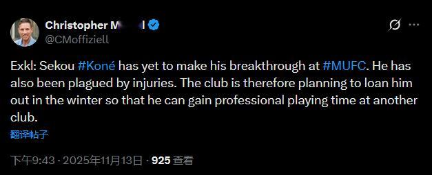 德国记者Christopher Michel曼联计划在一月份将塞库科内租借出去,以便他能在其他俱乐部获得职业比赛时间。